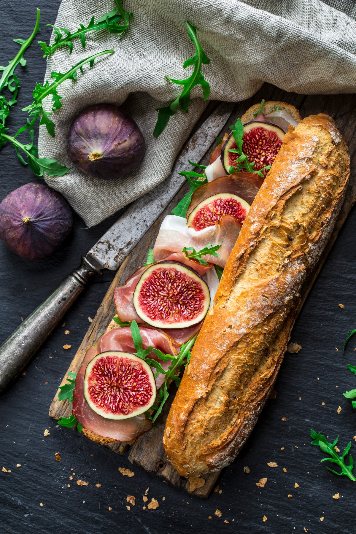 Kombinacija fig, pršuta in rukole je ena najbolj slastnih, saj predstavlja popolno ravnovesje med slanim, sladkim in grenkim. Bageto najprej narahlo popecite na ponvi ali v pečici, nato jo premažite z maslom, nanjo položite rukulo, rezine pršuta in fige. Okus lahko obogatite s kozjim sirom ter prelivom iz medu ali redukcijo balzamičnega kisa.