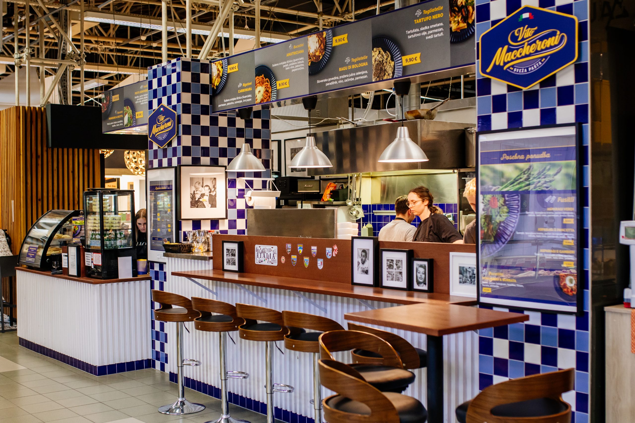 Kljub velikemu in prijetnemu skupnemu prostoru sredi kulinaričnega območja se namestimo za barom Vita Maccheronija, da lahko poleg testenin uživamo tudi v živahnem vzdušju za pultom.