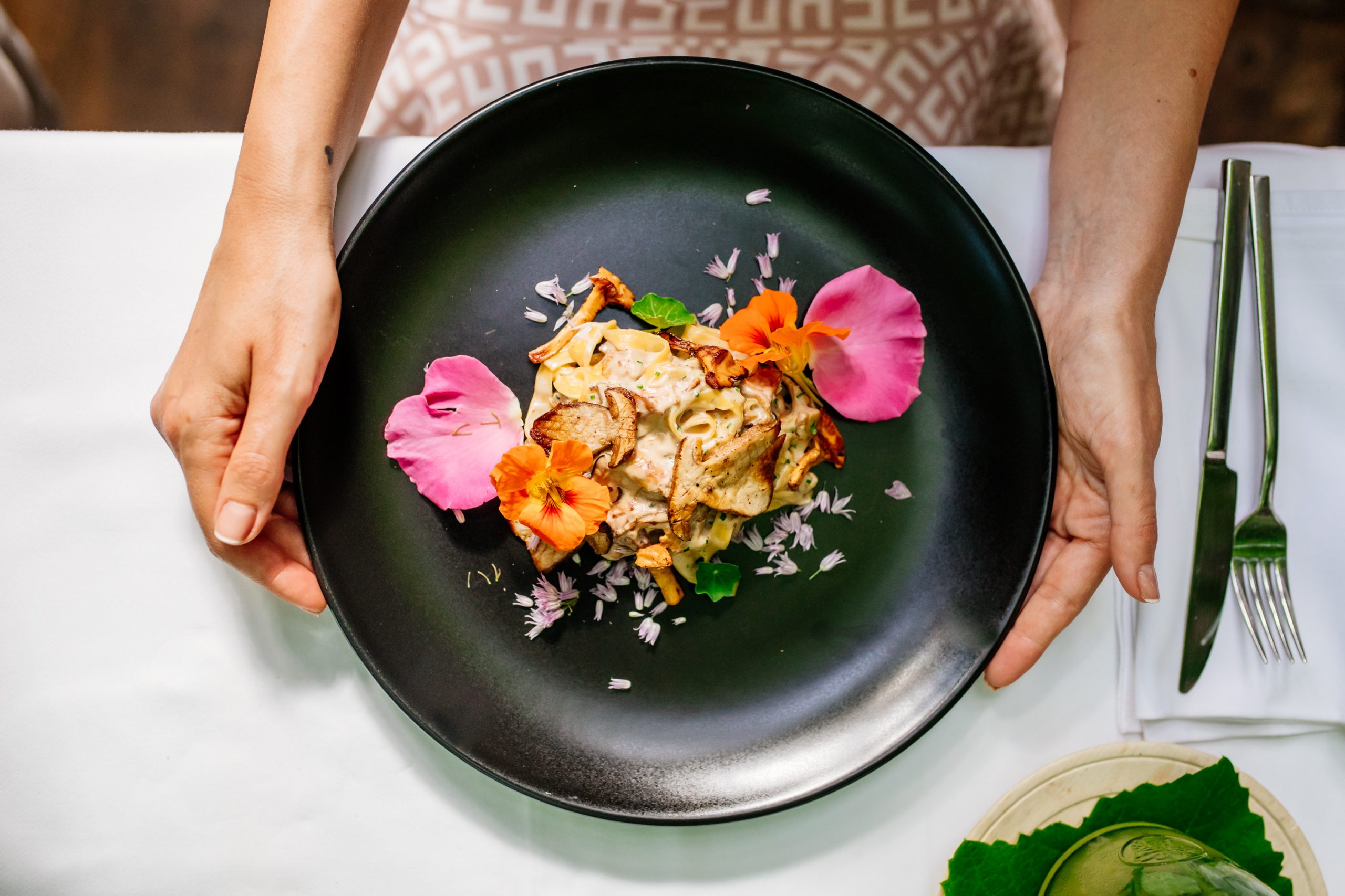 Na naše veselje na njihovem jedilniku ne manjka veganskih jedi. Ponudijo nam brezglutenske testenine s sojino smetano, zelenjavo in gobami ter nam natočijo domačo limonado z meliso. V pričakovanju kulinaričnega razvajanja trepetamo od nestrpnosti.
