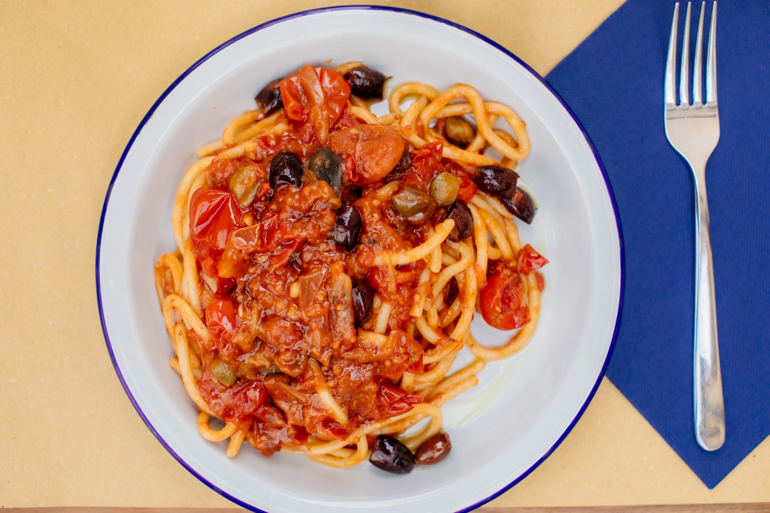 Na njihovem jedilniku so le ene veganske testenine, ki pa nas nemudoma prenesejo na toplo Sicilijo. ‘Spagettone alla Siciliana’ so debeli in grobi špageti z omako narejeno v pečici iz češnjevih paradižnikov, italianskih oliv, kaper, jajčevcev, rdeče čebule in česna. Nasitna, sočna in hkrati ležerna pojedina, ob kateri se da začutiti ustvarjalno srce Italije. Sveže testenine so ročno izdelanе, narejenе po tradicionalnem italijanskem receptu, а šefove omake lahko nabavimo tudi za domov.
