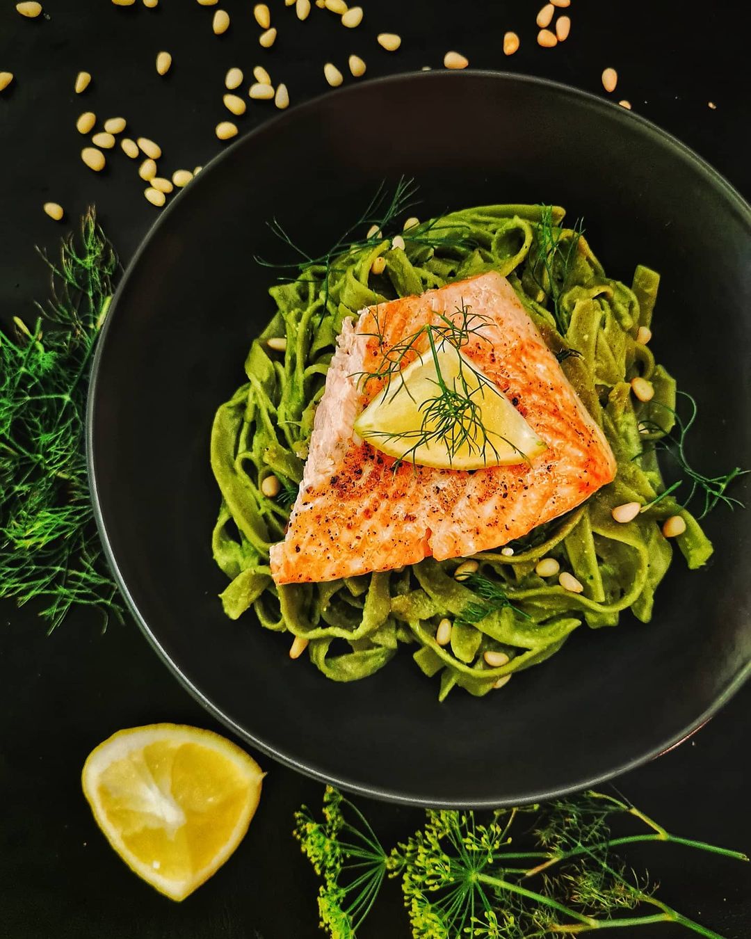 - Na koncu dodajte popražene pinjole in koprc in na lososa pokapajte še malce soka limone.