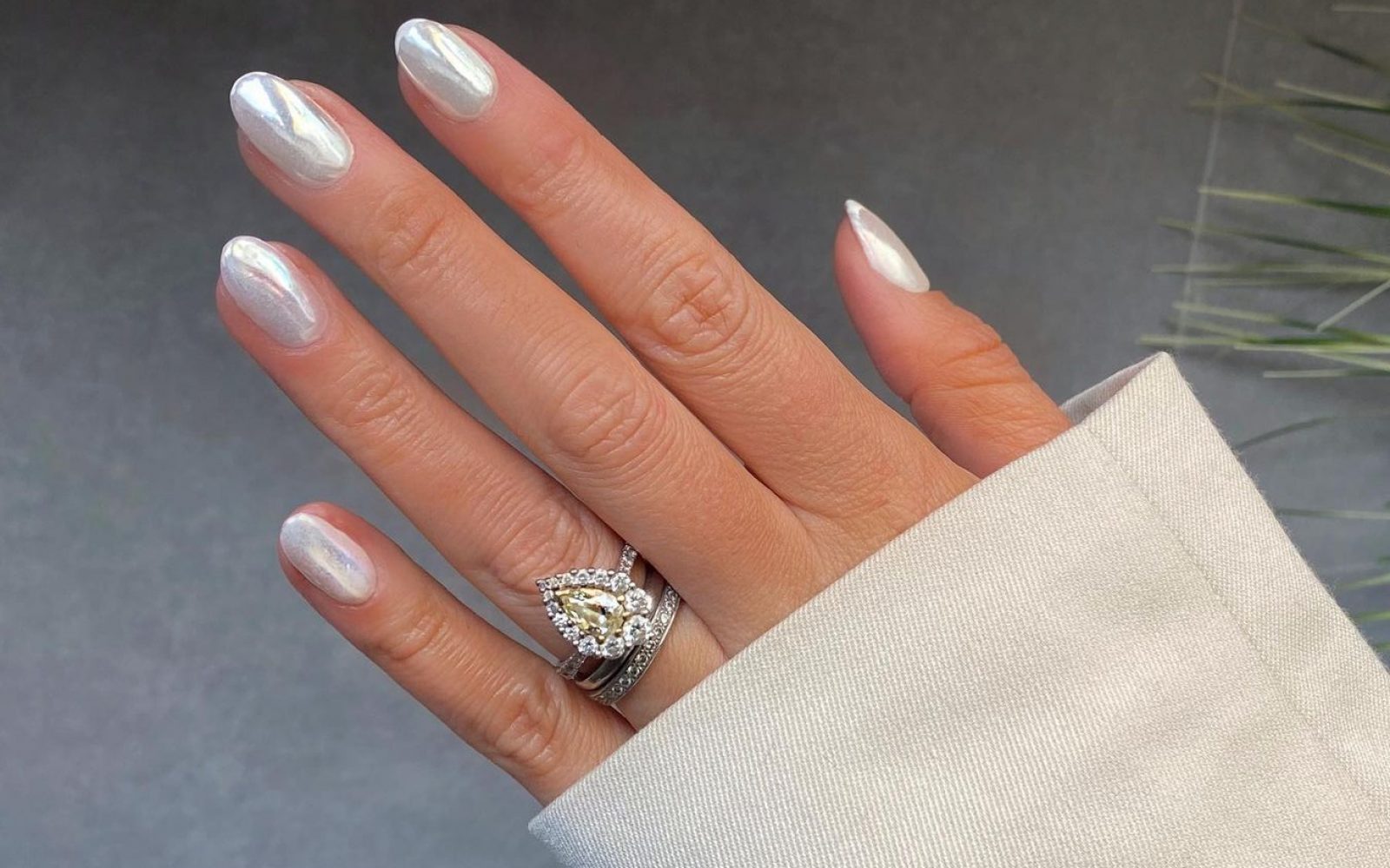 Čeprav smo estetiko vanilla girl pustili v času zime, jo še vedno želimo nositi na nohtih s posebnim kromiranim pridihom. Vanilla chrome manikura je postala pomladni trend, ki se nadaljuje tudi v poletje. Ta manikura je kot nalašč za tiste neveste, ki želijo nevtralno barvo nohtov, vendar z nečim, kar jih dvigne na višjo raven. Nežna barva vanilije in sijoč chromirani zaključni sloj na nohtih? Rekli smo “da”.
