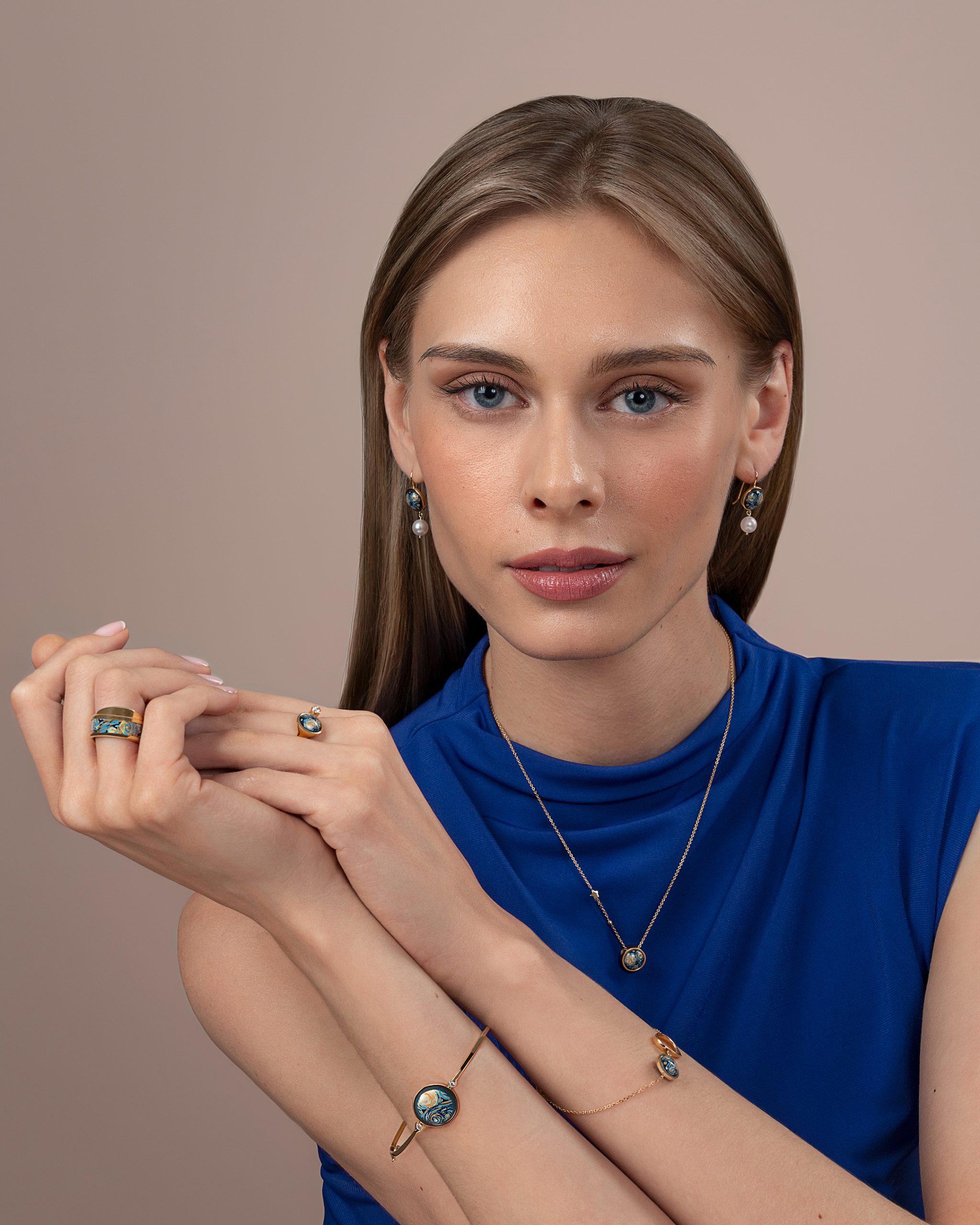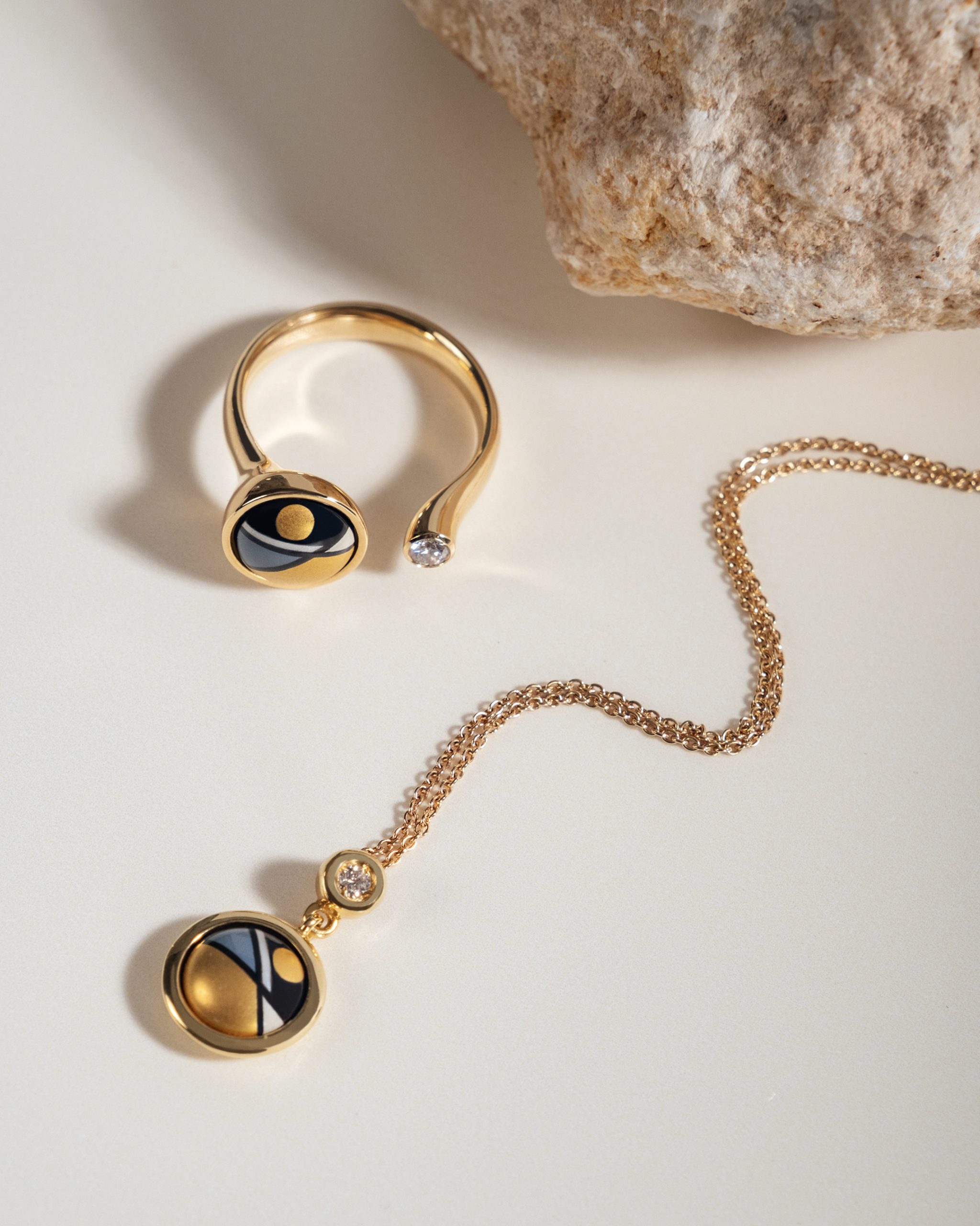 Decenten obesek, ki očara s svojo preprostostjo in eleganco. Osrednji del obeska je izdelan iz plemenitega emajla, ročno poslikan in okrašen v tehniki finega emajliranja. Obdaja ga nežen okvir iz čistega 18-karatnega zlata, ki je na zadnji strani skrbno brušen, tako da se obesek popolnoma prilega vznožju vratu.