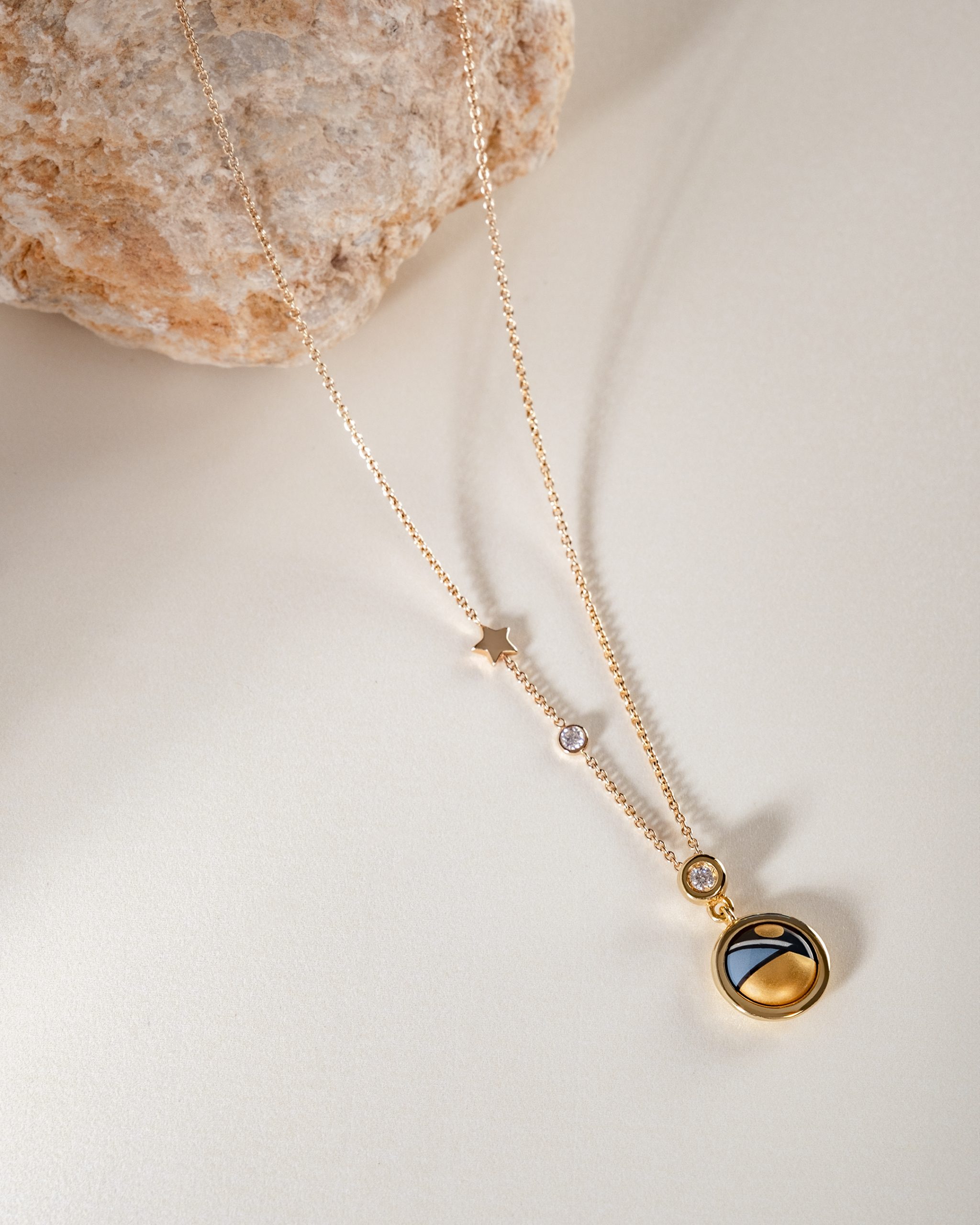 Obesek Cabochon očara s svojo subtilno eleganco in minimalizmom. Njegova okrogla oblika simbolizira edinstvenost in popolnost. Ročno poslikan emajl je uokvirjen v 18-karatno zlato, lepoto te umetniške miniature pa dodatno poudari harmonična kompozicija, ki jo ustvari v kombinaciji z verižico. Na zgornjem delu obeska sta dve diskretni odprtini, verižica pa neopazno prehaja skozi to elegantno strukturo.