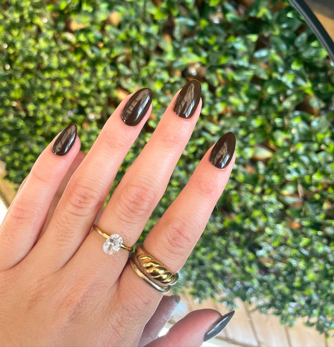 Razkošen odtenek z globino na nohtih elegantno razkriva vse bogate podtone rjave barve.