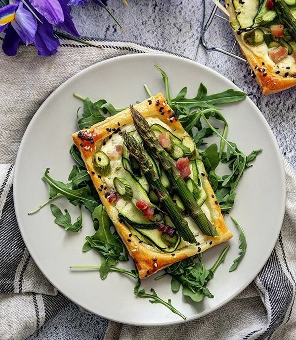 Listnato test, brie in šparglji so glavne sestavine, v košarico pa lahko dodate še na rezine narezano bučko ter koščke popečene slanine. Odličen zajtrk ali malica, ki so jo lahko nesete tudi v službo ali vzamete na pot.
