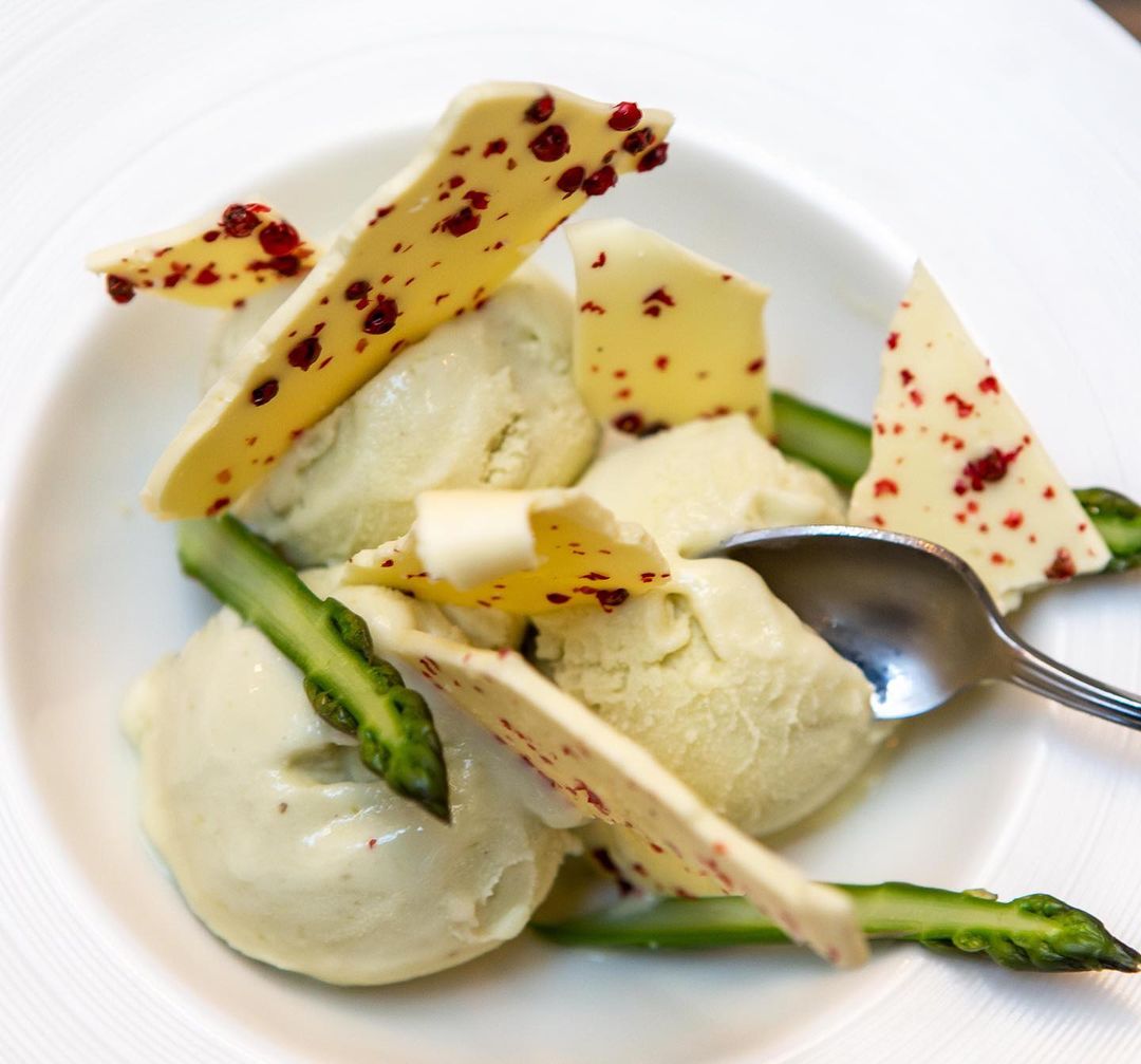 Ena najbolj ekstravagantnih jedi z našega seznama je špargljev sladoled. Osnova je vaniljev sladoled, ki mu dodate nekaj špargljev. Šparglje kuhajte v smetani, mleku in sladkorju do mehkega ter obvezno precedite, nato zmiksajte v blenderju.