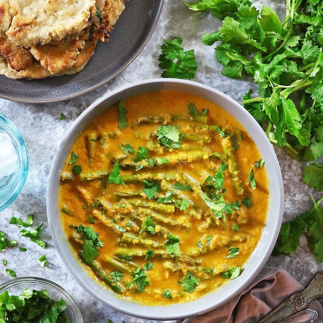 Kari je tradicionalna indijska jed, ki jo lahko pripravimo v enem loncu, vanjo pa vključimo poljubne sestavine. Če ste naveličani piščančjega karija ali čičerikinega karija, izberite šparglje. Pazite, da je omaka v celoti pripravljena preden dodate šparglje, da jih ne boste preveč razkuhali.