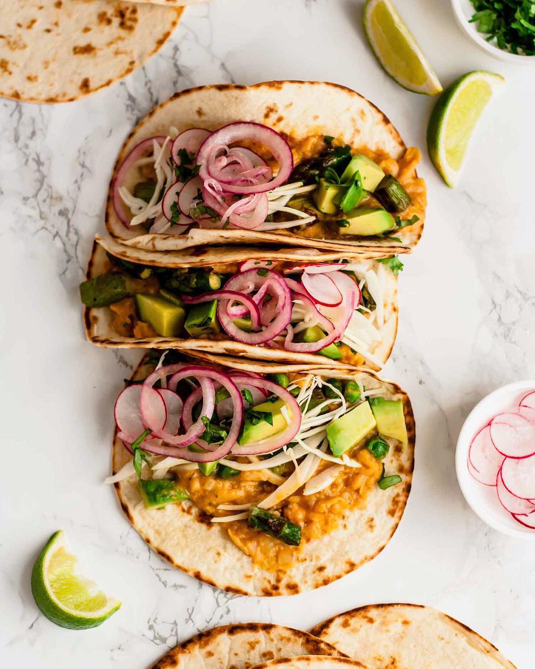 Ljubitelji mehiške hrane in tacosov boste navdušeni nad to vegetarijansko različico. Na popečeno tortiljo namažite rahlo pekočo omako iz belega fižola, dodajte sveži avokado, popečene šparglje, okisano čebulo in belo zelje. Ne pozabite še na limetin sok.
