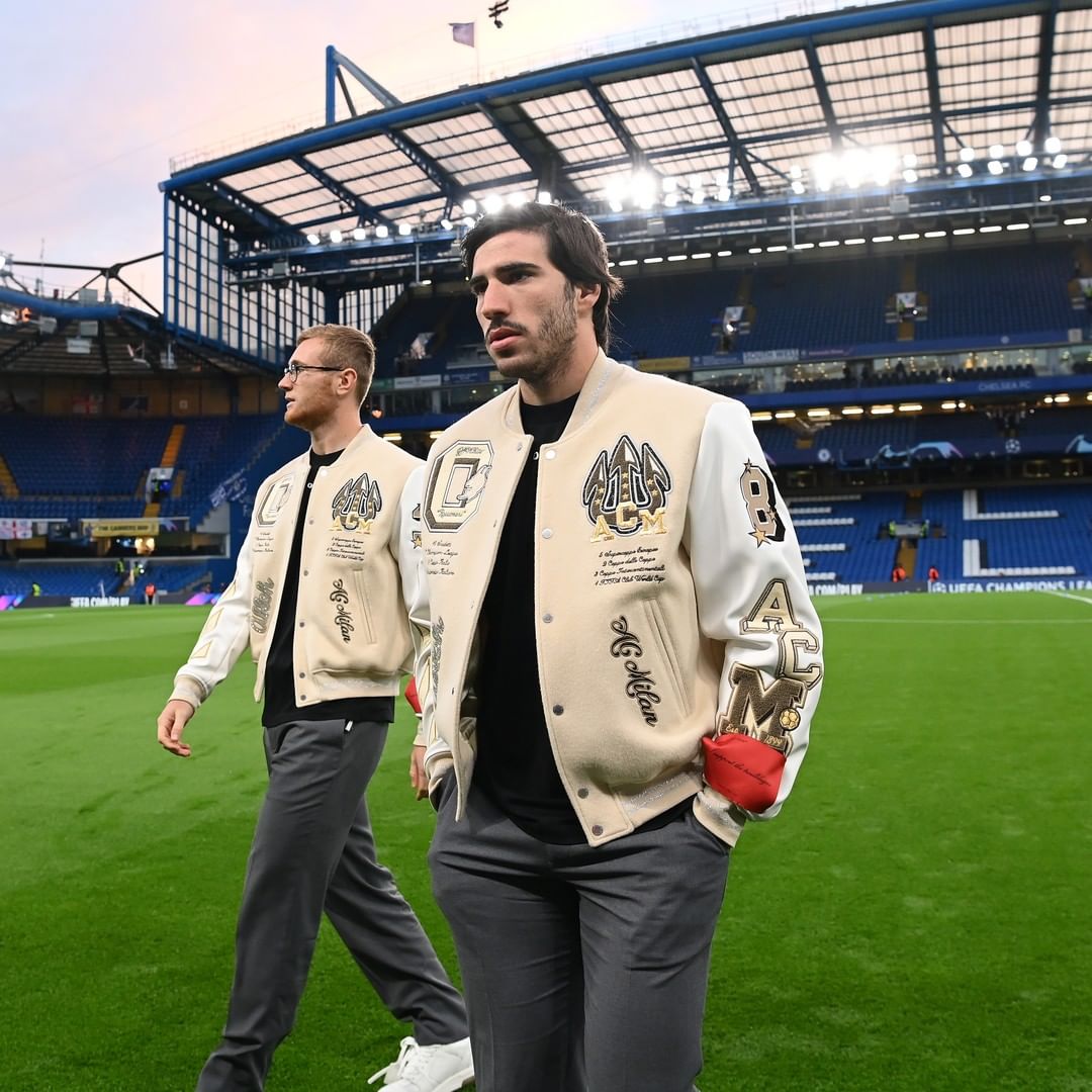 Ekipa AC Milan se je po Londonu sprehajala v krem univerzitetnih jaknah Off-White, ki spominjajo na Ablohovo univerzitetno kolekcijo z Louisom Vuittonom.