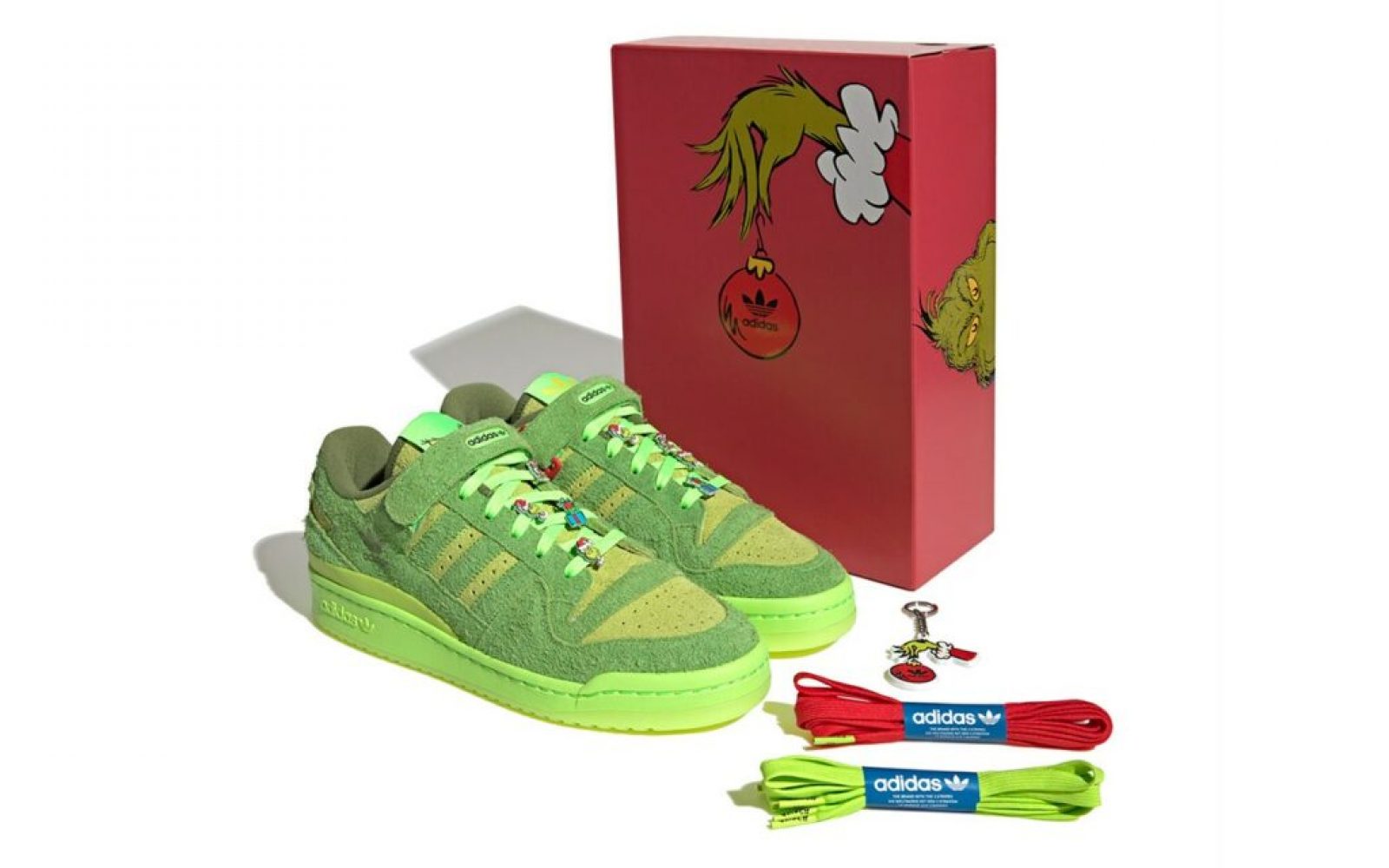 Superge Forum prispejo v rdeči škatli z risbo Grincha, ki drži okrasek za smrečico, na kateri je natisnjen logotip Adidas. V ponudbi imamo tudi dva dodatna kompleta vezalk v rdeči in zeleni barvi.