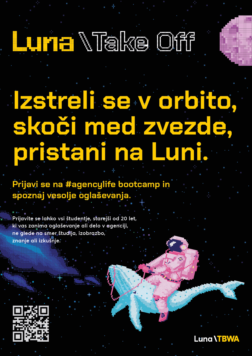 Agencija Luna \TBWA vabi vse, starejše od 20 let, ki vas zanima oglaševanje ali delo v agenciji, da se prijavite na program Luna \TAKE OFF. To bo prvi enomesečni #agencylife bootcamp, kjer lahko mladi na lastni koži izkusite delo v najbolj učinkoviti oglaševalski agenciji v Sloveniji.