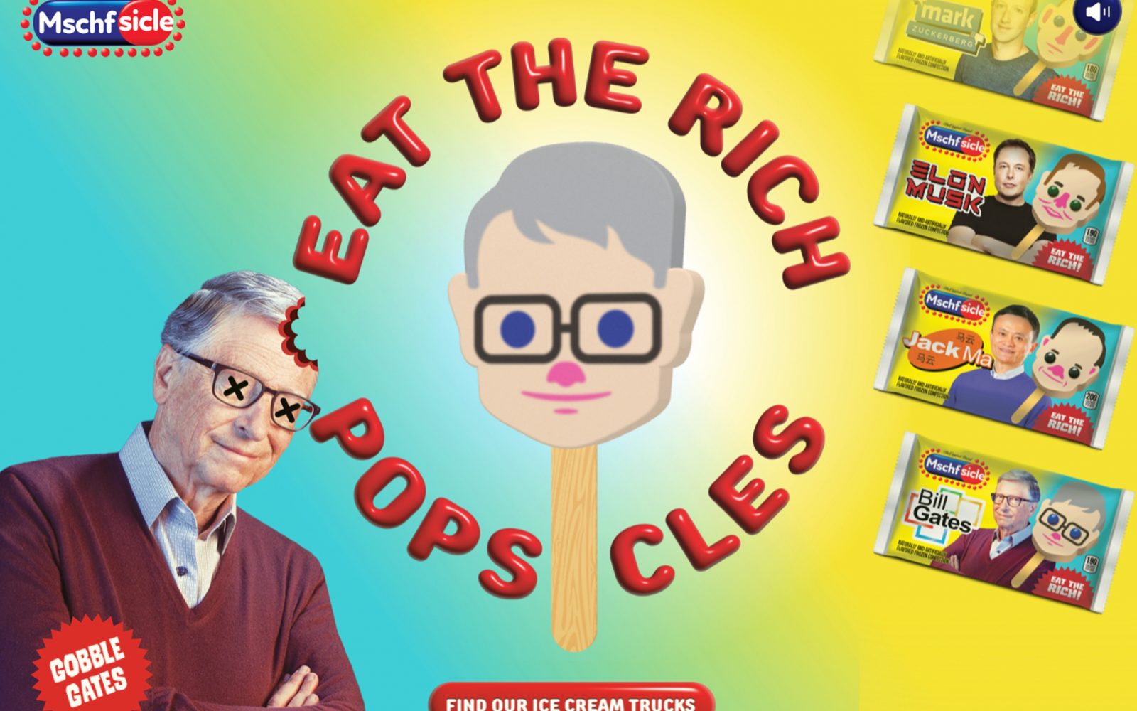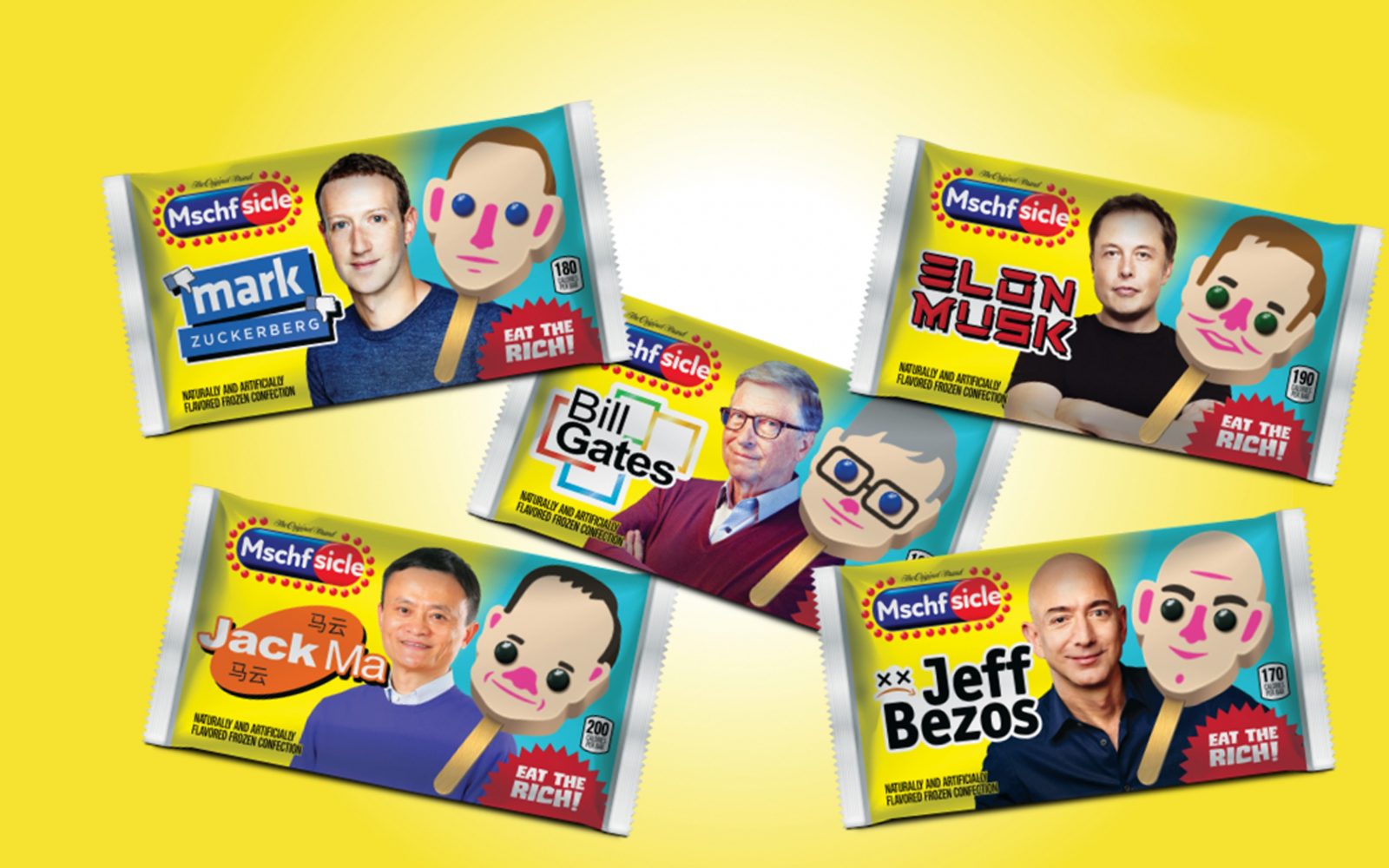 Pet svetovnih milijarderjev je bilo spremenjenih v sladoledne lučke. Ustanovitelja Facebooka Marka Zuckerberga, vodjo Tesle Elona Muska, izumitelja Amazona Jeffa Bezosa, direktorja Microsofta Billa Gatesa in kitajskega poslovnega magnata Jacka Maja je newyorški umetniški kolektiv MSCHF ovekovečil kot kul poletne poslastice.