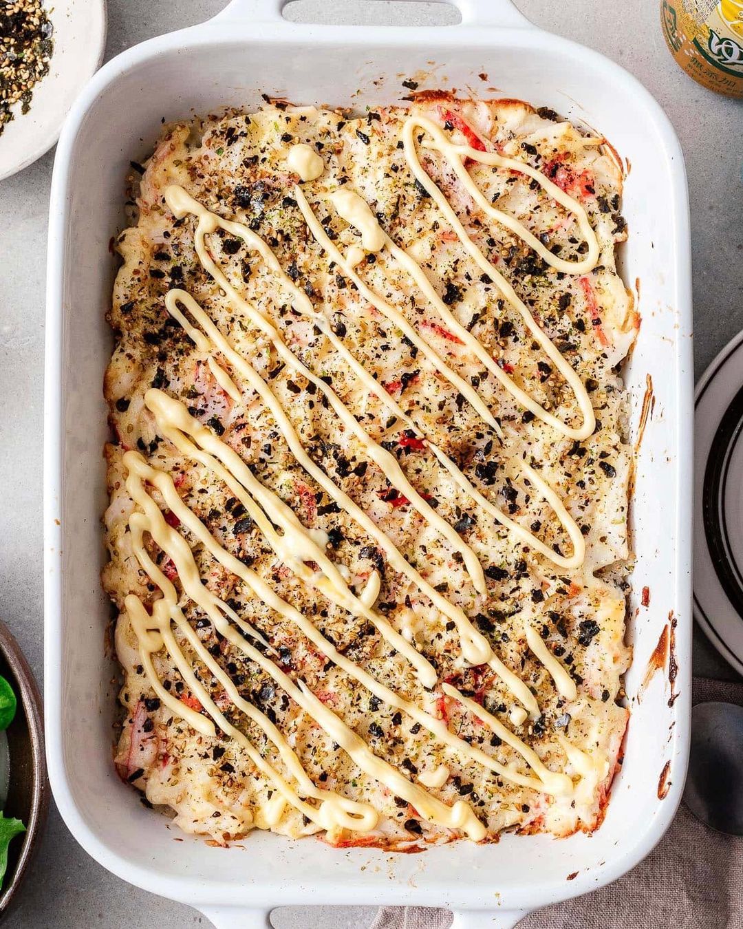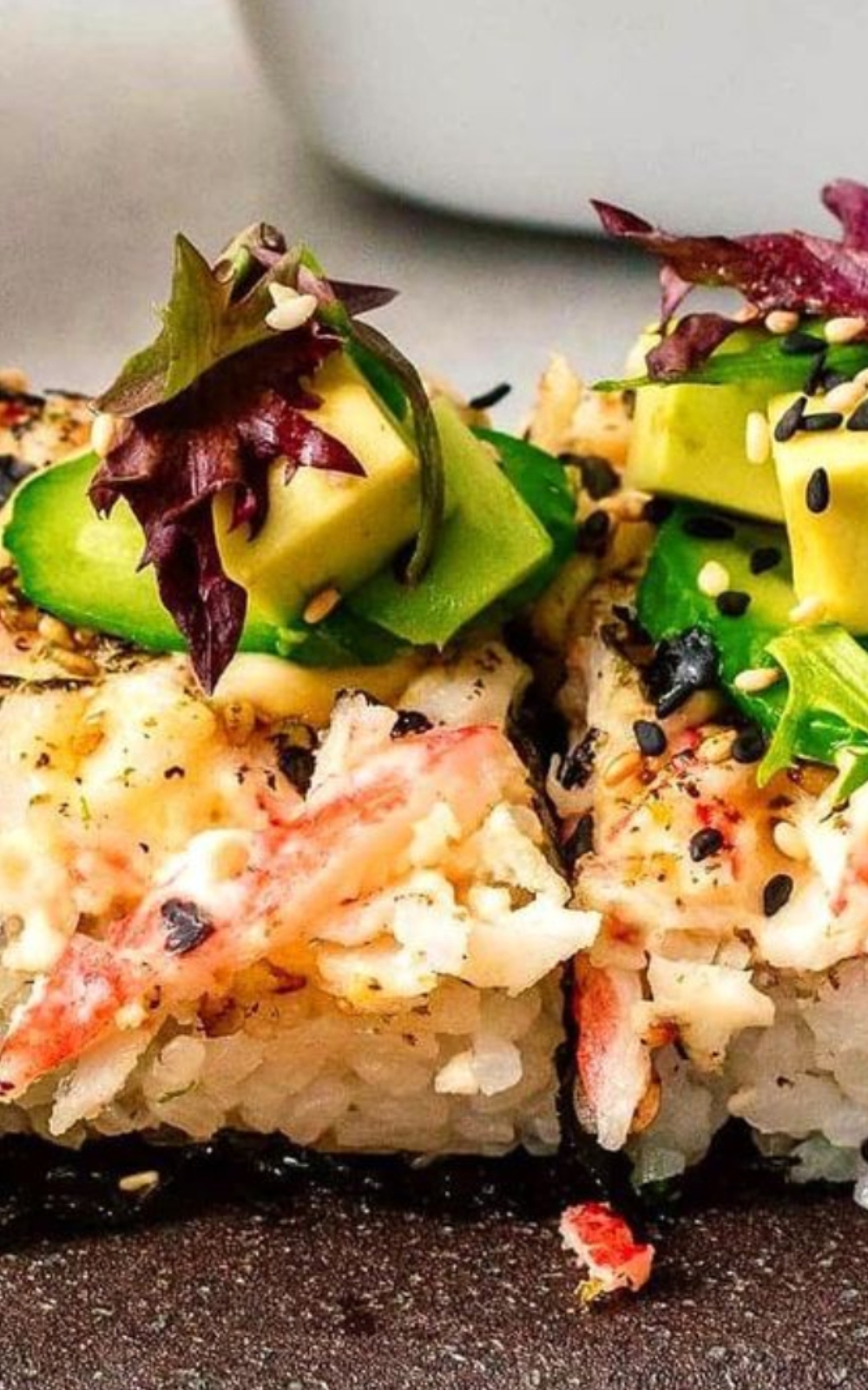 - Pečen suši lahko na koncu prelijete po vrhu še z japonsko majonezo in sriracho ter potresete z mlado čebulo in črnim sezamom.