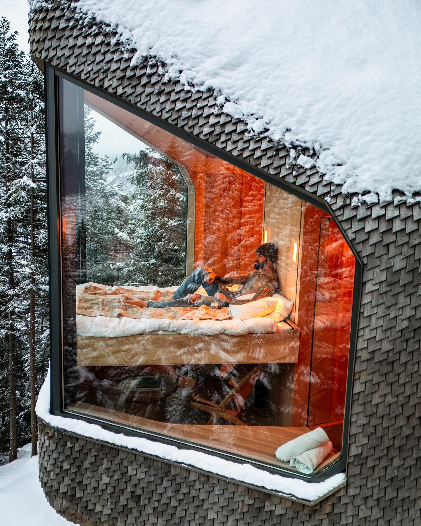 V hišici, ki se nahaja 6 metrov nad gozdnimi tlemi, boste doživeli razkošje na najvišji stopnji, hišica pa je tudi pravi arhitekturni presežek. Zunanjost, ki spominja na borove storže, je izdelana iz 18.000 kosov lesenih skodel, ki hišico na drevesu neopazno zlijejo z njenim naravnih okoljem.