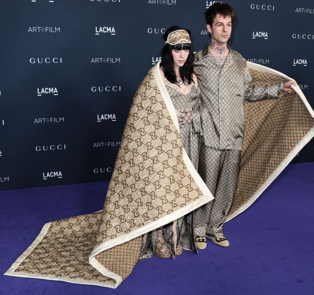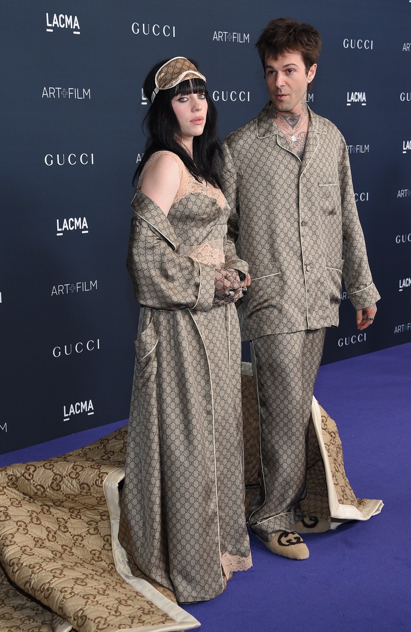 Billie Eilish in Jesse Rutherford sta v soboto debitirala na rdeči preprogi na dogodku LACMA Art + Film Gala 2022, kjer sta fotografom pozirala objeta pod ogromno Guccijevo odejo. Oba sta bila tudi od glave do pet oblečena v pižamo znamko Gucci.