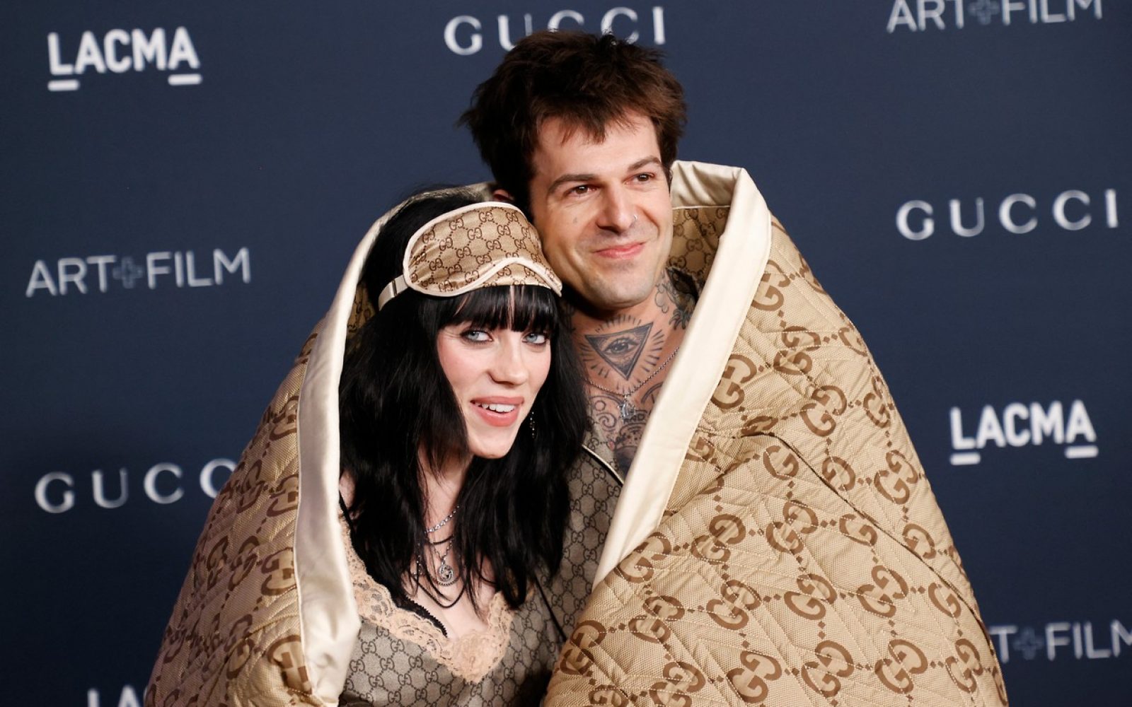 Billie Eilish in Jesse Rutherford sta v soboto debitirala na rdeči preprogi na dogodku LACMA Art + Film Gala 2022, kjer sta fotografom pozirala objeta pod ogromno Guccijevo odejo. Oba sta bila tudi od glave do pet oblečena v pižamo znamko Gucci.