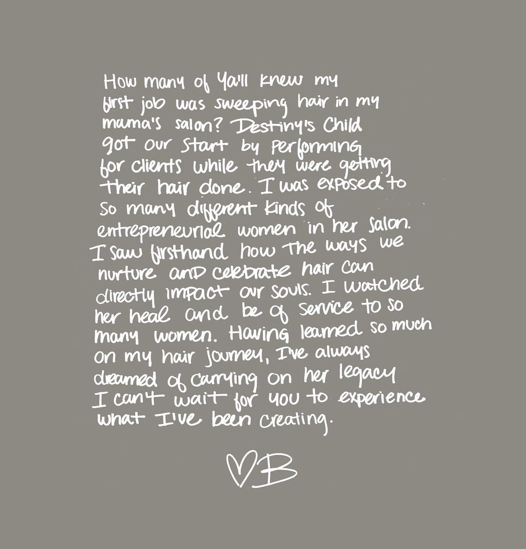 “Destiny’s Child smo začele z nastopi za stranke, medtem ko so si te urejale lase. V njenem salonu sem bila izpostavljena toliko različnim vrstam podjetnic. Iz prve roke sem videla, kako lahko načini, kako negujemo in slavimo lase, neposredno vplivajo na naše duše. Ker sem se toliko naučila o svojih laseh, sem vedno sanjala, da bom nadaljevala njeno dediščino,” pojasnjuje. “Komaj čakam, da izkusite, kar sem ustvarila.”