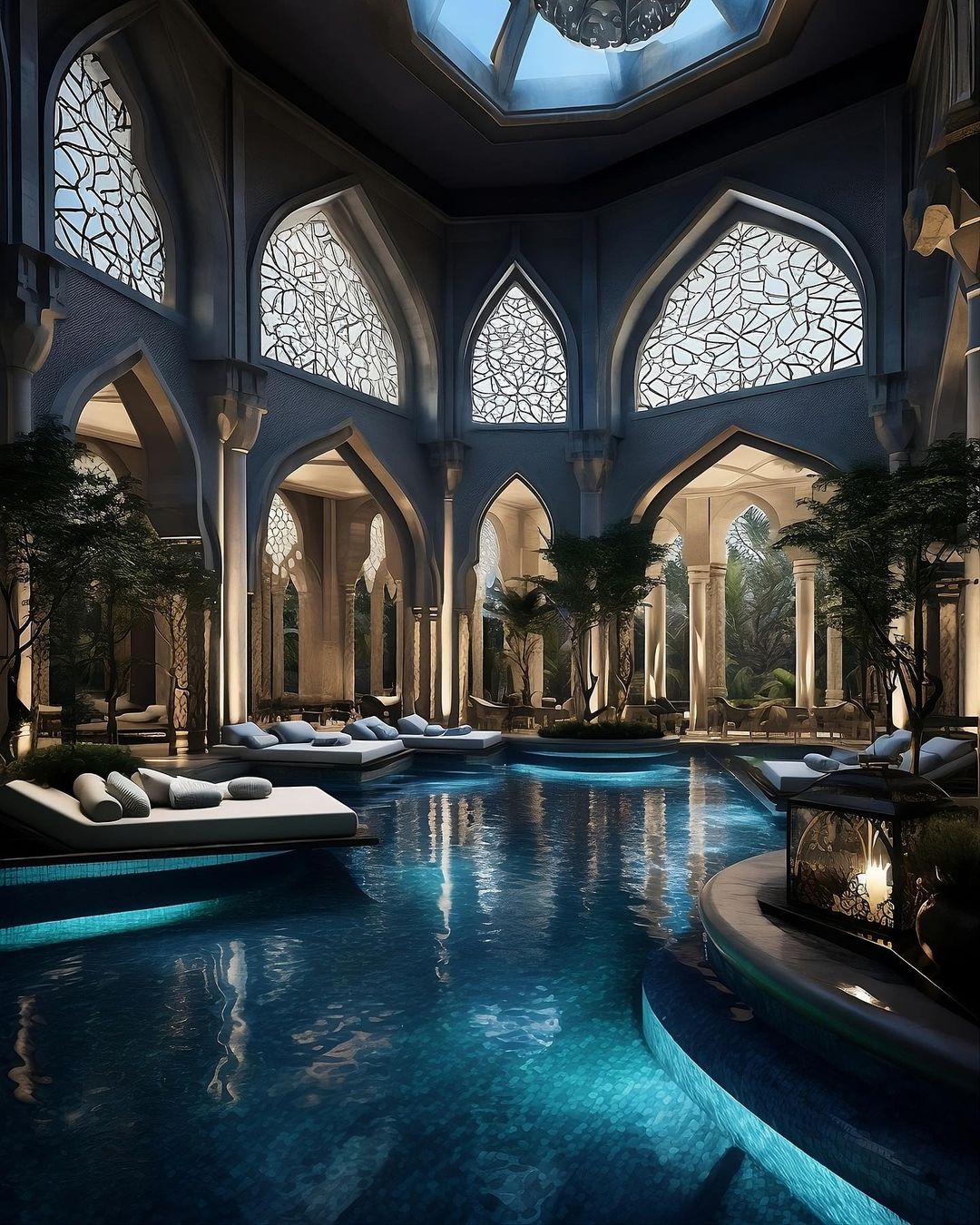 Arhitekti so si zunanjost zamislili v slogu tradicionalne arabske vile z zavitim zunanjim prostorom, neskončnim bazenom in številnimi prostori za poležavanje na soncu. Bazen se skriva tudi v razkošni notranjosti. Dvorec je mešanica modernega in klasičnega, s tradicionalnimi savdskimi motivi, ki se pojavljajo povsod.
