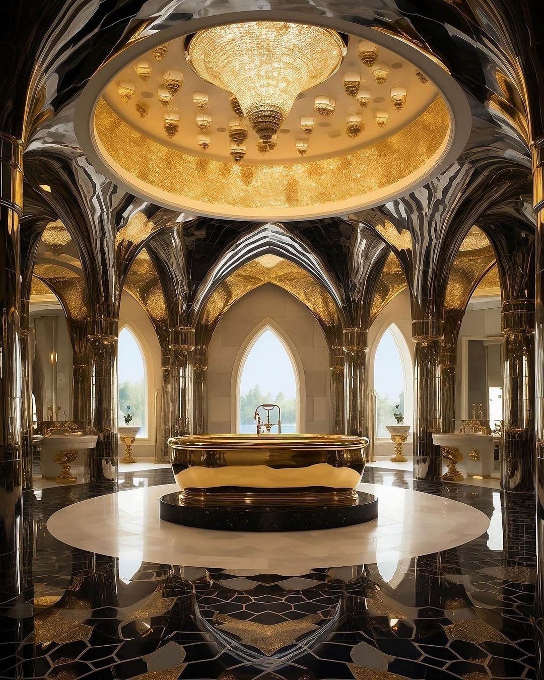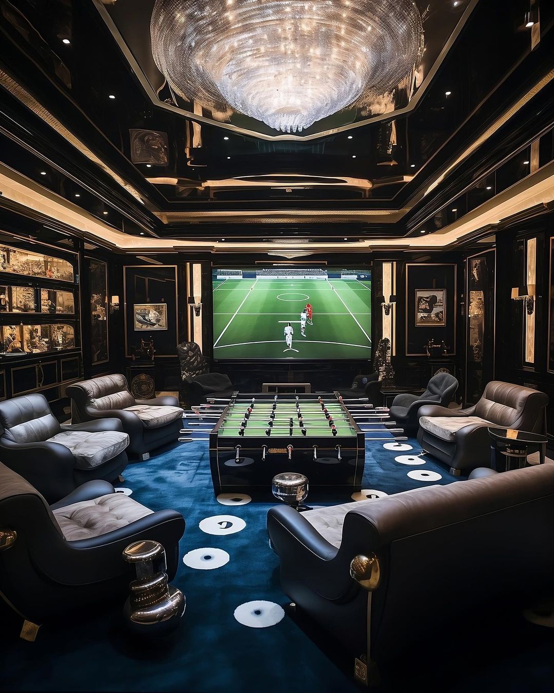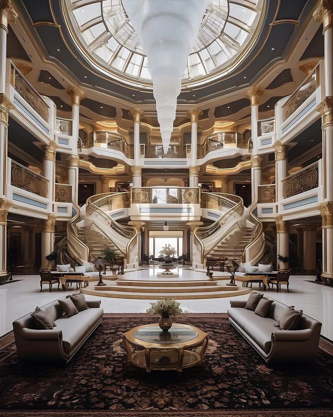 Vhodna dvorana je veličastna, z dvojnim stopniščem in ogromnim steklenim lestencem, ki deluje malce zastrašujoče. Spa soba se blešči v zlatu z osrednjo veliko kopalno kadjo izdelano iz zlata, ki je umeščena pod oboke. Prestiž je ujet v vse kotičke, tudi igralno sobo, katere središče predstavlja ročni nogomet ter ogromen zaslon.