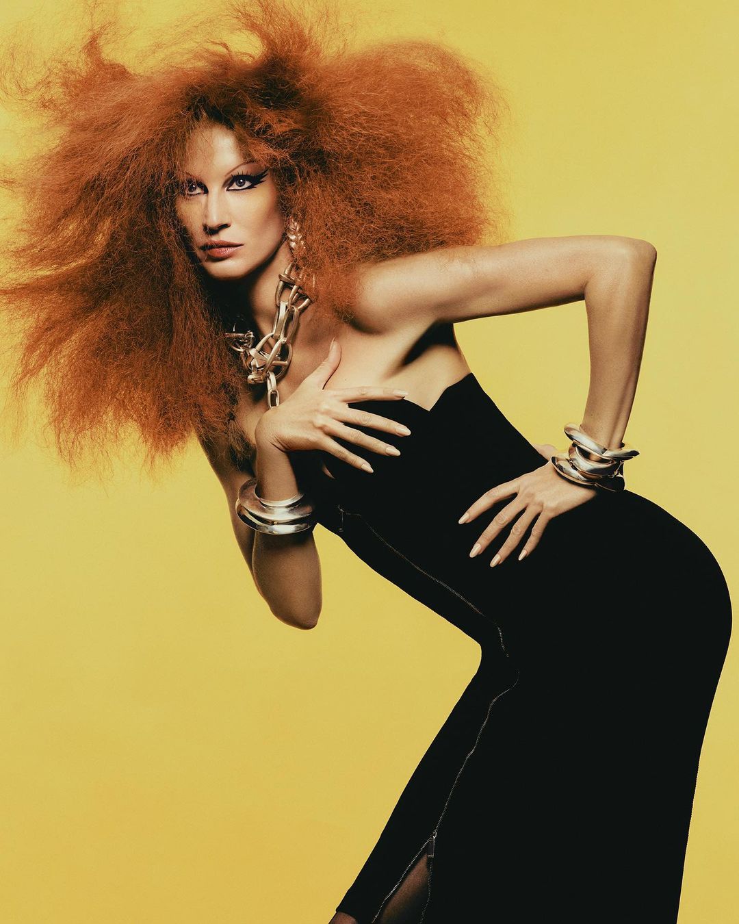 Drznost je bila očitno rdeča nit snemanja, saj Gisele na drugih fotografijah pozira še v rdečem suknjiču iz jagnječjega usnja Saint Laurent in tesni obleki iz viskoze.