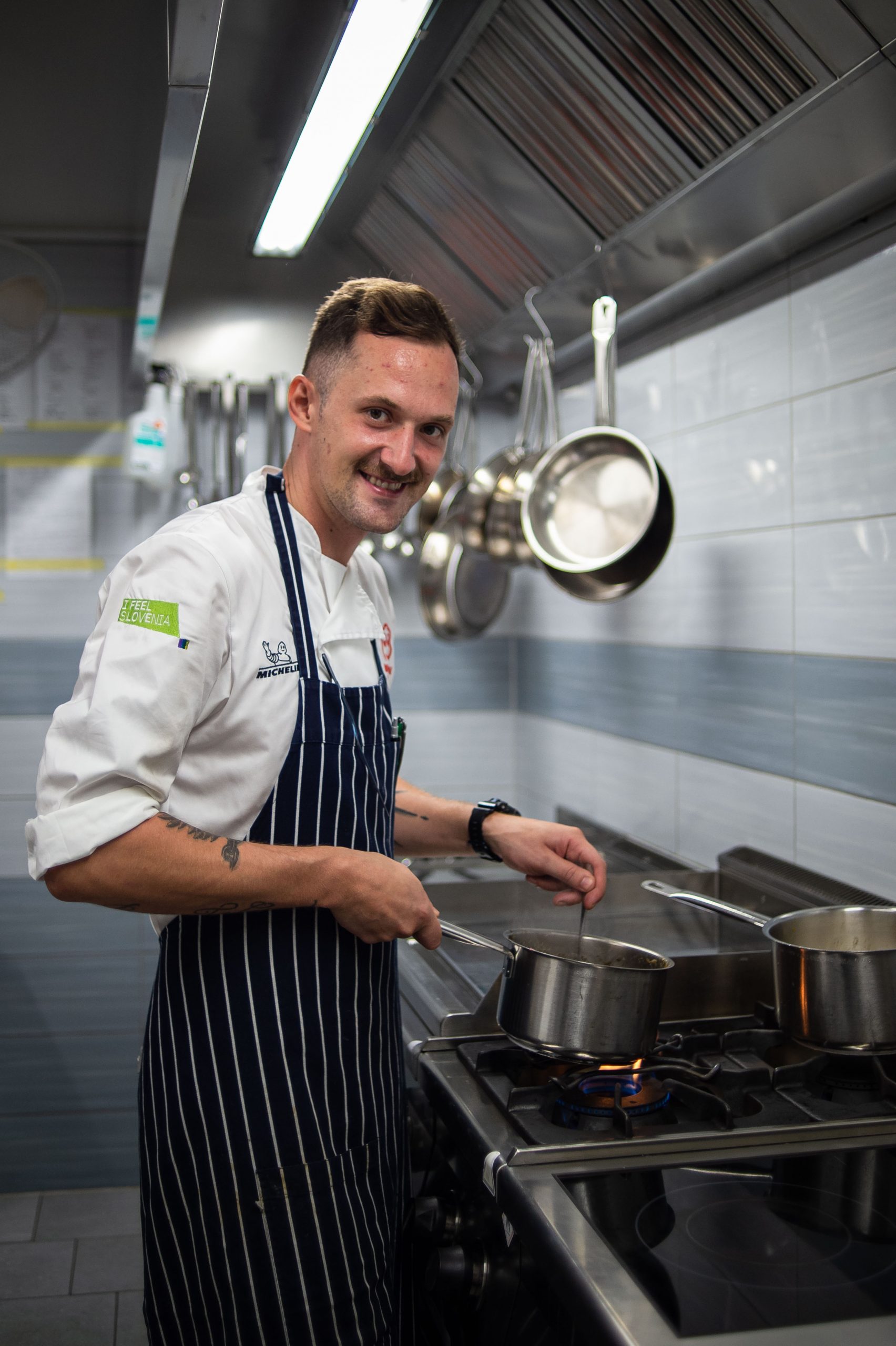 30-letni Prekmurec velja za enega najboljših chefov mlajše generacije v Sloveniji. Spominja se, da je že v otroštvu zelo rad poprijel za kuhalnico – z mamo sta največkrat delala prekmursko gibanico. V svoje jedi še danes rad vključuje sestavine iz svojih krajev, seveda na zelo prefinjen, nevsakdanji način. “Na meniju imamo recimo file romba z ocvirki od Kodile,” pove, medtem ko svojim kuharjem že daje navodila za pripravo kosila.