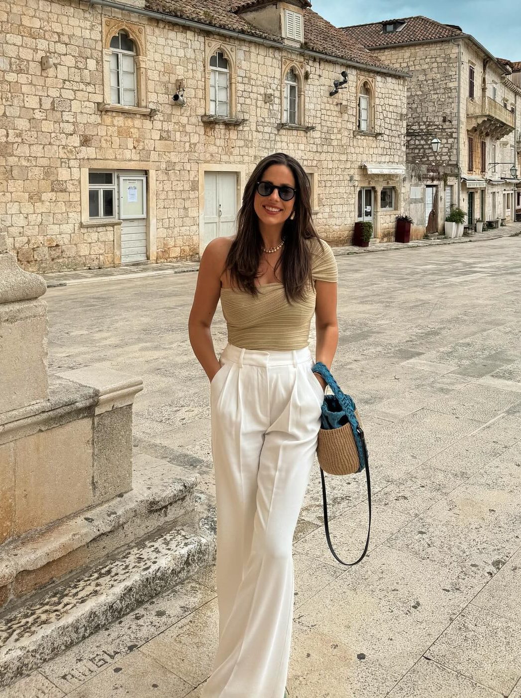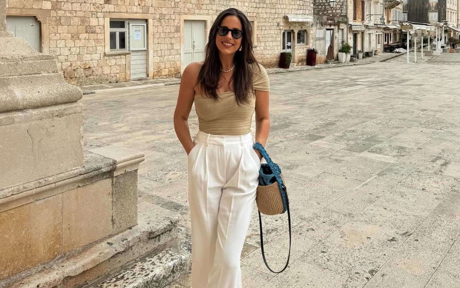 Pleteni top je kombinirala s trendovskimi dolgimi belimi hlačami v slogu kostima in z dodatkom pletene torbice z detajli jeansa ta videz spremenila v stilsko modno kombinacijo za vsak dan.