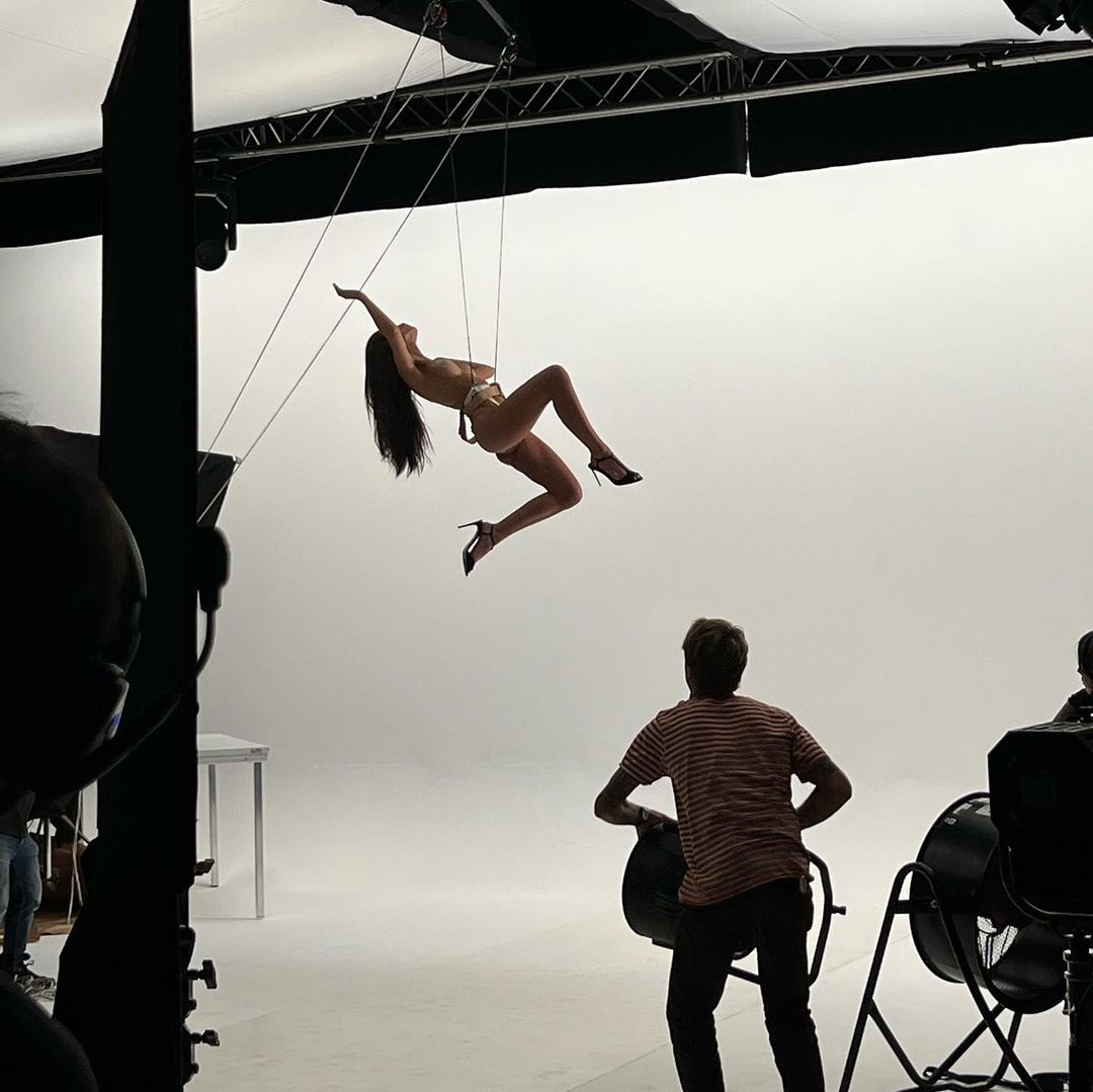 Na fotografijah in videu je videti, kako binglja s stropa, pripeta z zaščitnim pasom, na sebi pa ima le še visoke pete. V videu je nakazala nekaj svojih manekenskih sposodbnosti, kako jo na hitro spustijo po vrveh, nato pa naredi nekaj gracioznih gibov rok in nog, pri čemer izgleda lahkotno in elegantno.