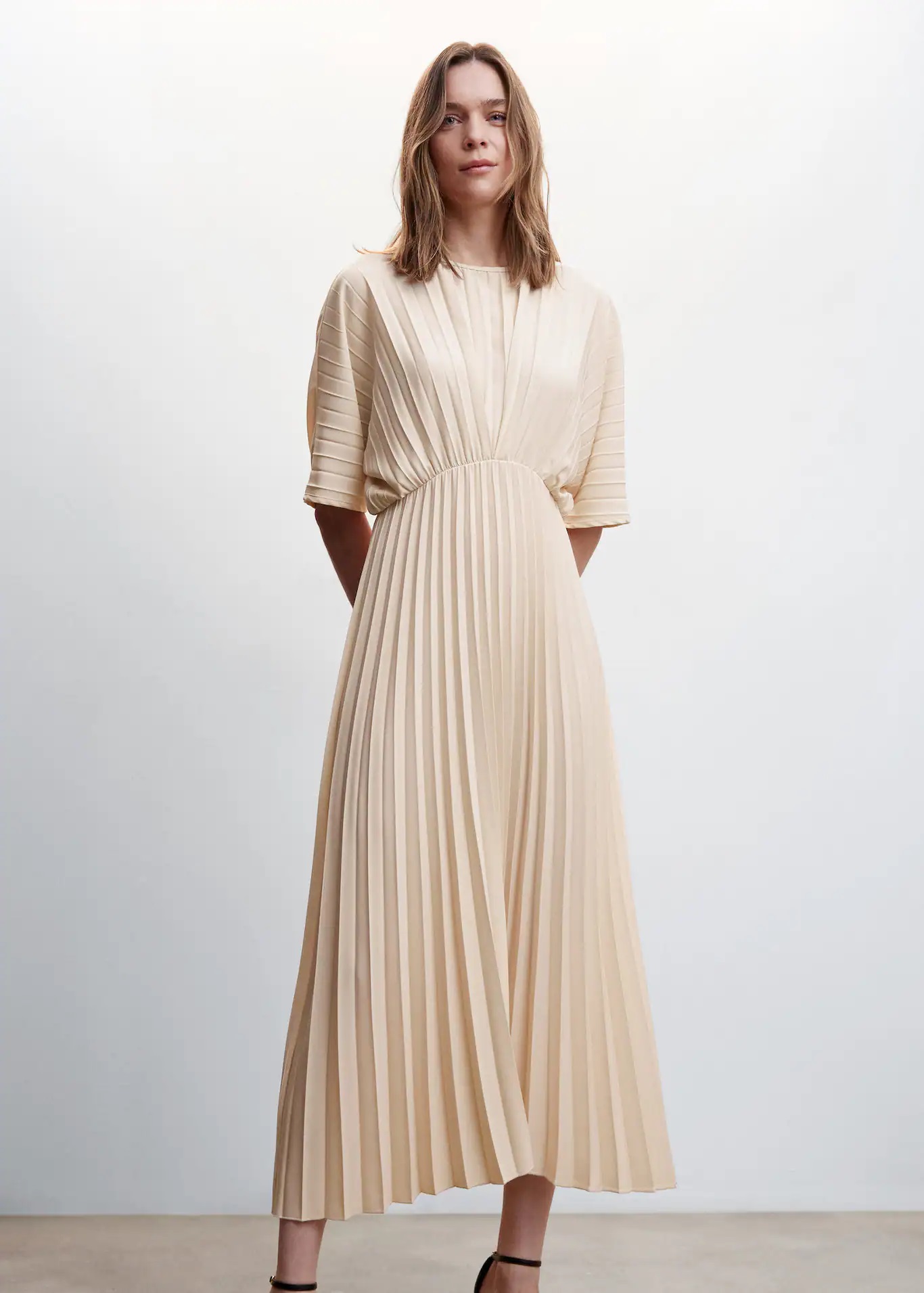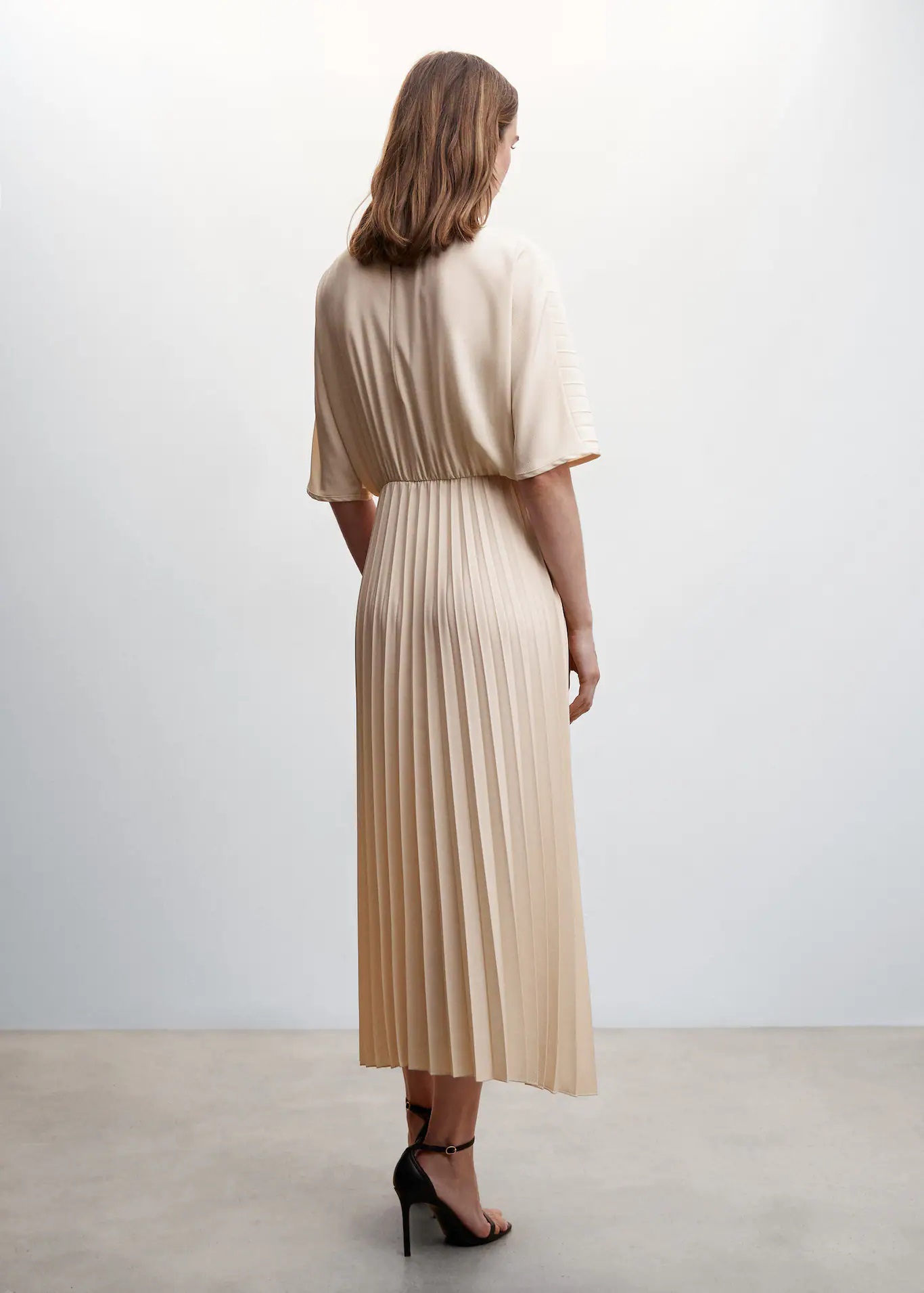 Gre za plisirano obleko iz Manga v skoraj enakem odtenku, ki lepo poudari pas in razširi zgornji del. Za razliko od Evine je spredaj zaprta, namesto dolgih pa ima malce krajše rokave, ki so prav tako elegantni.