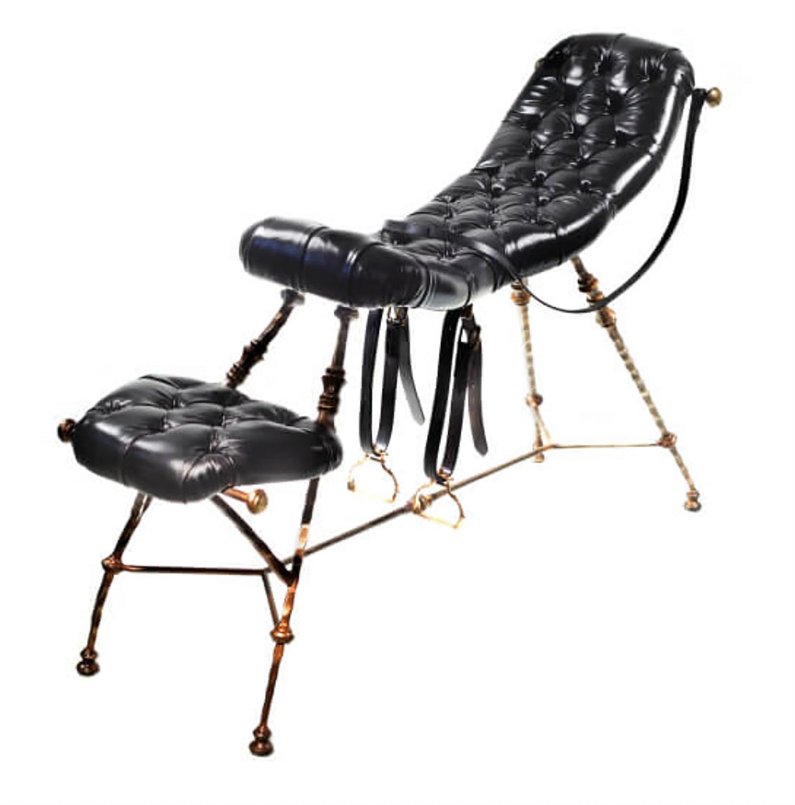 Ali gre za seks stol ali za kos pohištva v posebnem stilu? Stol je oblečen v črno usnje in v resnici bi mu težko rekli stol, saj bi na njem bolj ležali kot sedeli, da ne gre za običajen stol pa namigujejo tudi paščki, ki so privezani na stol.