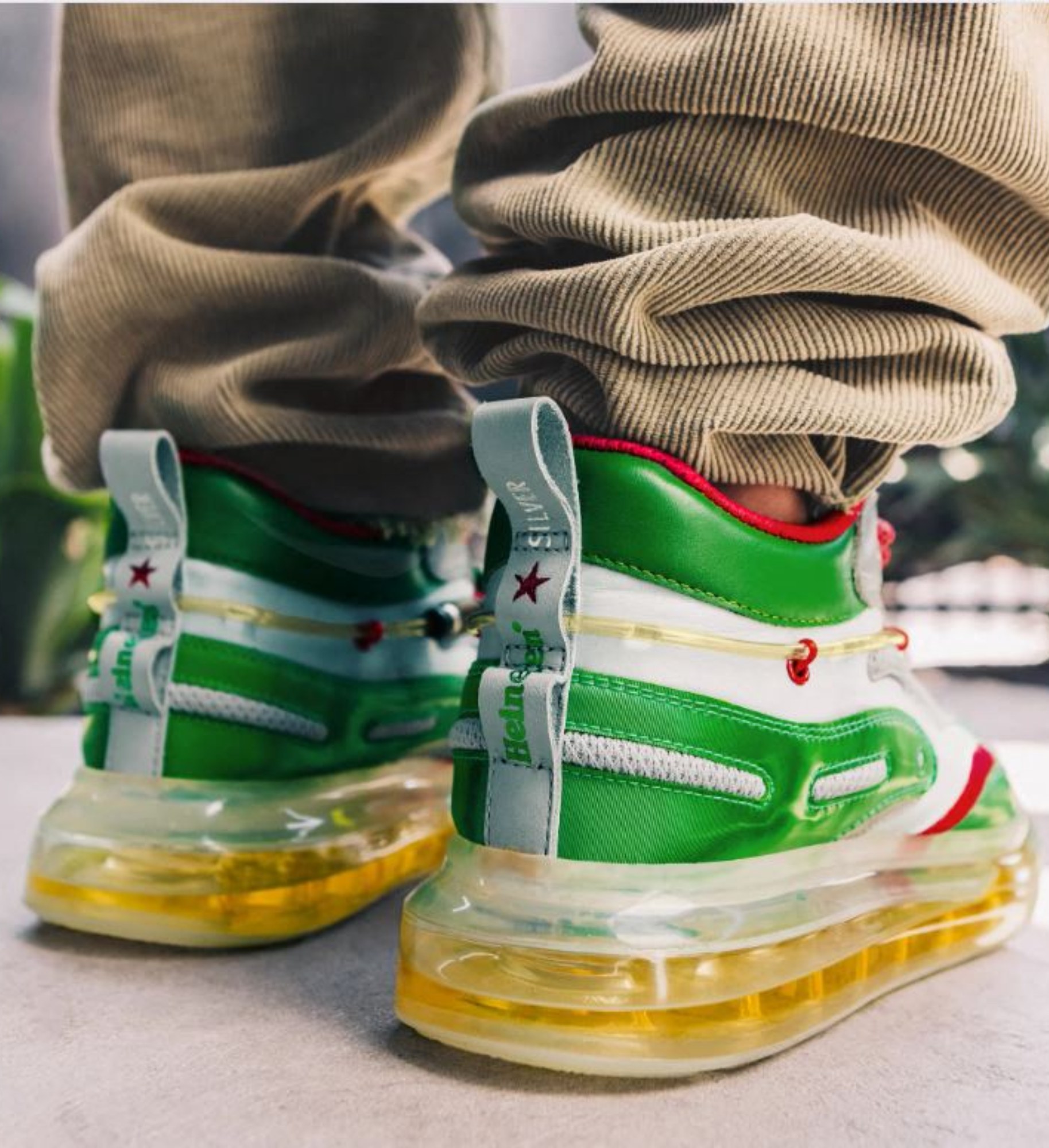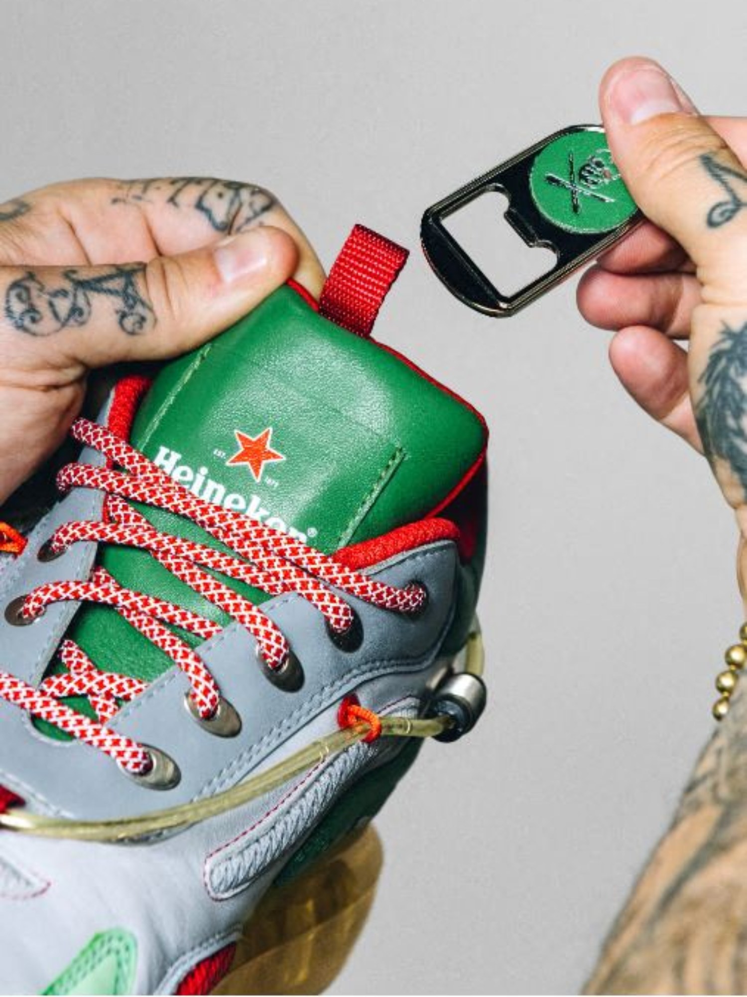 Dizajn športnih copatov izraža podobo znamke, predvsem z zeleno, sivo in barvo, v kombinaciji z rdečimi odtenki in Heinekenovo zvezdo na jeziku, v katerem se skriva tudi snemljiv odpirač za steklenice.