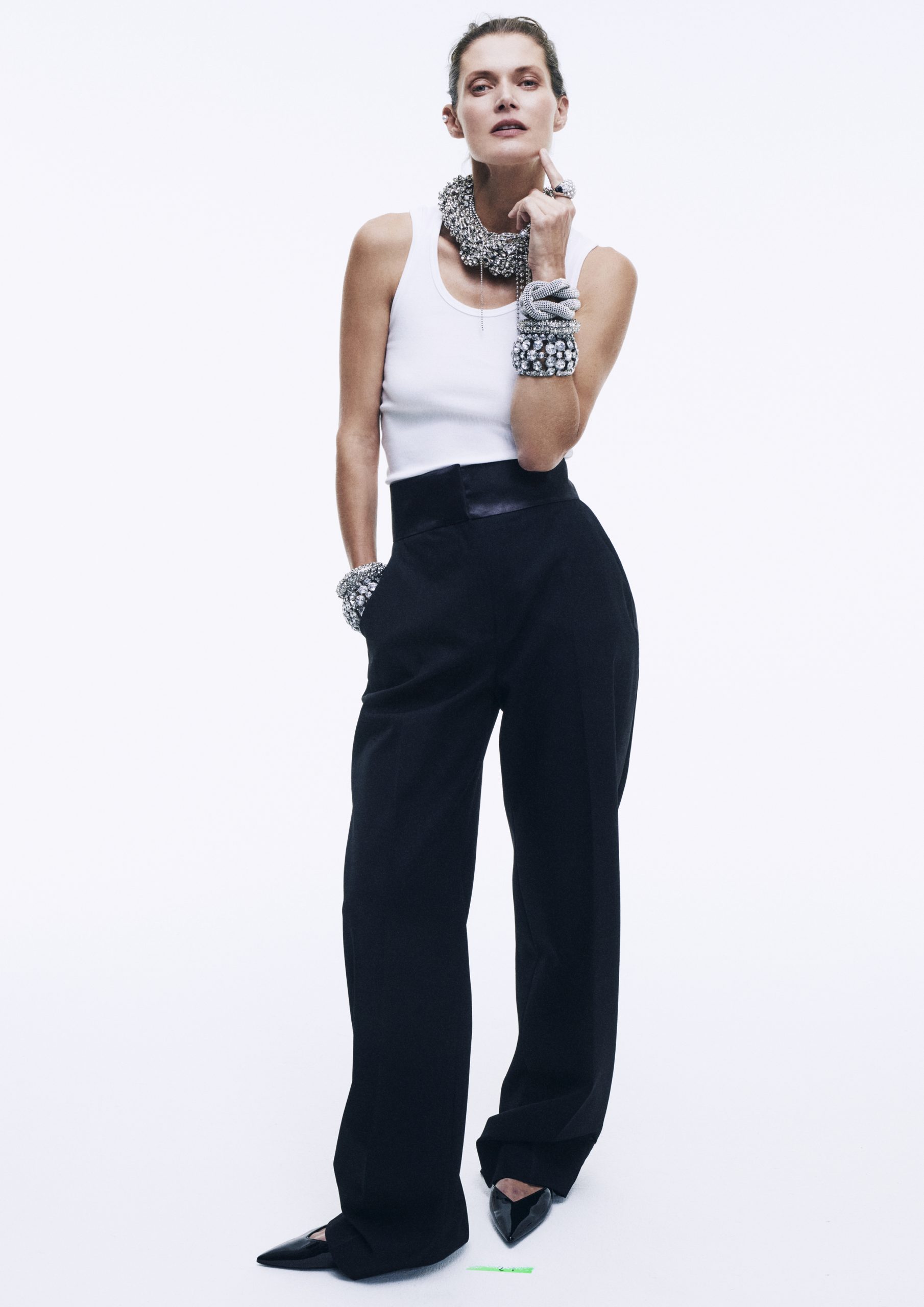 V enobarvni barvni paleti črne, bele in srebrne, ključni kosi kolekcije vključujejo bandeau smoking, skrajšana bleščeča jakna z metuljčki, smoking srajco iz poplina, dolga krila in svetleče obleke. Močna ramena, ozki pasovi in tekoče linije držijo moč, medtem ko pretirane pentlje, oversized naborki in svetleči elementi povzdignejo vsak kos. Hlače so dolge, široke in polne, v asimetričnih oblekah iz džersija in vsestranskih topih pa je mogoče opaziti kiparsko drapiranje.
