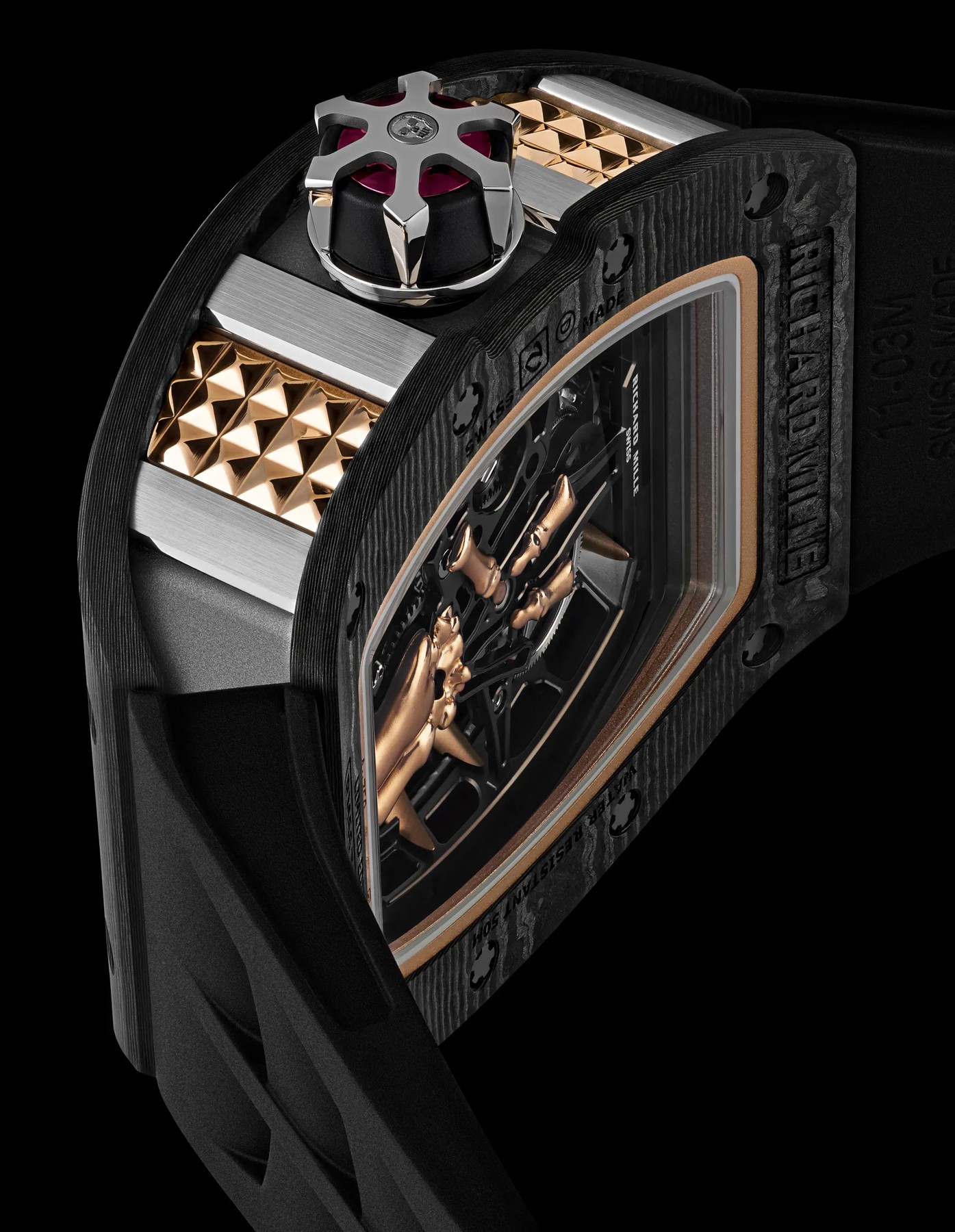 Ohišje ima obliko soda in je izdelano iz strojno obdelanega kompozita ogljikovih vlaken, ki ga je razvil Mille in se imenuje Thin Ply Technology ali na kratko TPT.