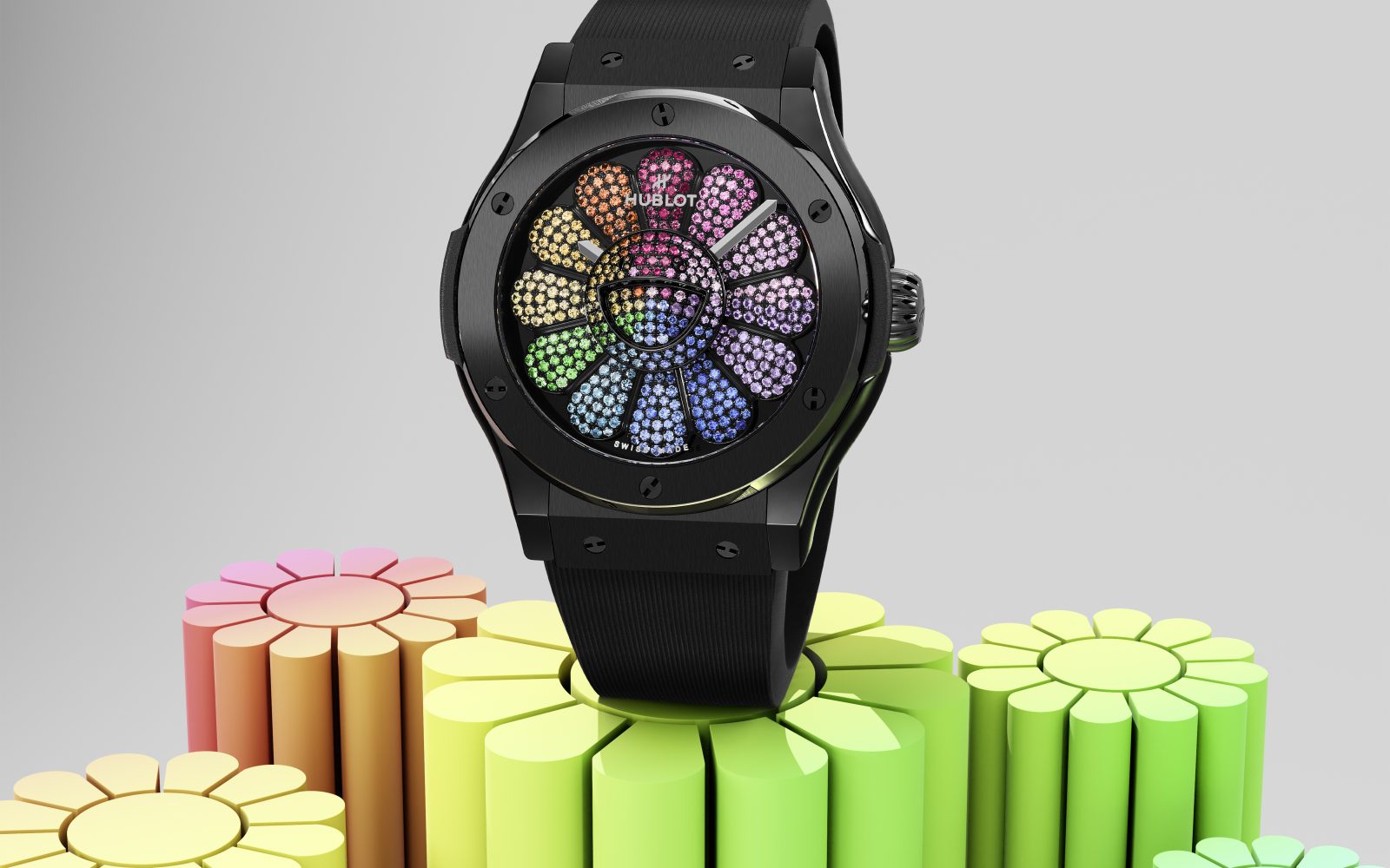 Motiv številčnice je znameniti emblem umetnika Murakamija in sicer cvet s smeškotom. Mavrični motiv je ovit v 45-milimetrsko ohišje iz črne keramike, ki je kombiniran s paščkom iz gume. Cvet sestavlja dvanajst cvetnih lističev, ki tvorijo popoln gradient rubinov, safirjev, ametistov, tavoritov in topazov.