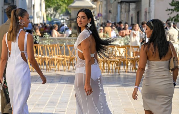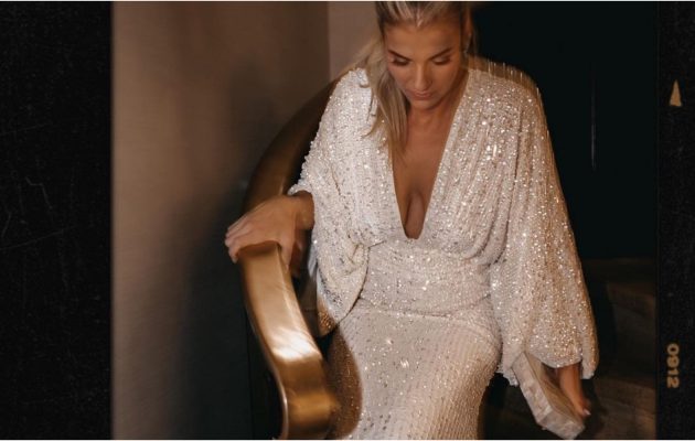 Do oltarja se je sprehodila v bleščeči kreaciji Ellie Saab z dolgimi rokavi in kvadratnim izrezom, ki je bile posuta z drobnimi perlicami, kasneje pa se je preoblekla v obleko v slogu grške boginje, s spuščenimi rokavi in srčastim izrezom.