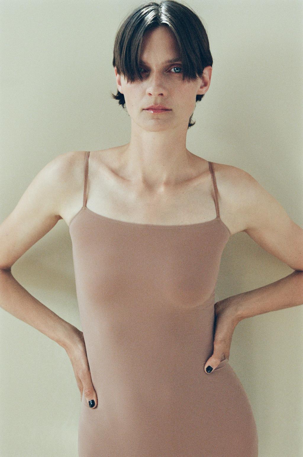 V ponudbi boste našli dve dolgi obleki z naramnicami v kožni barvi in črni barvi, kolekcijo mini oblek v usnju, čokoladi, črni in sivi barvi ter kolekcijo shapewear oblačil, ki vključuje kolesarske hlače, ki jih lahko nosite pod najljubšimi poletnimi oblekami.
