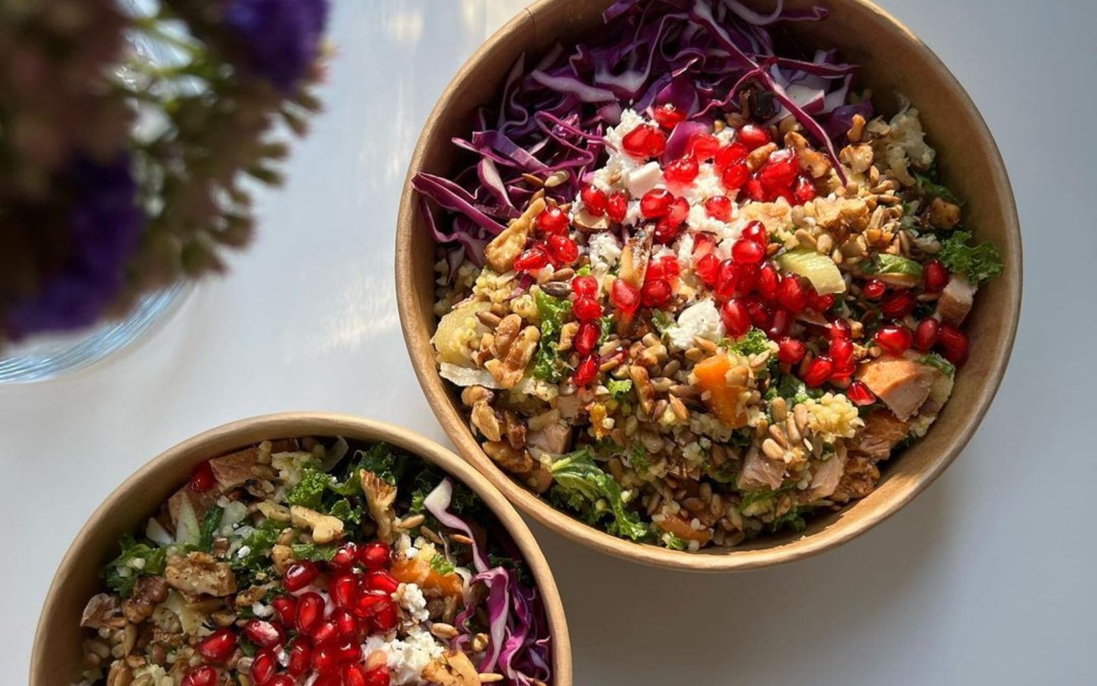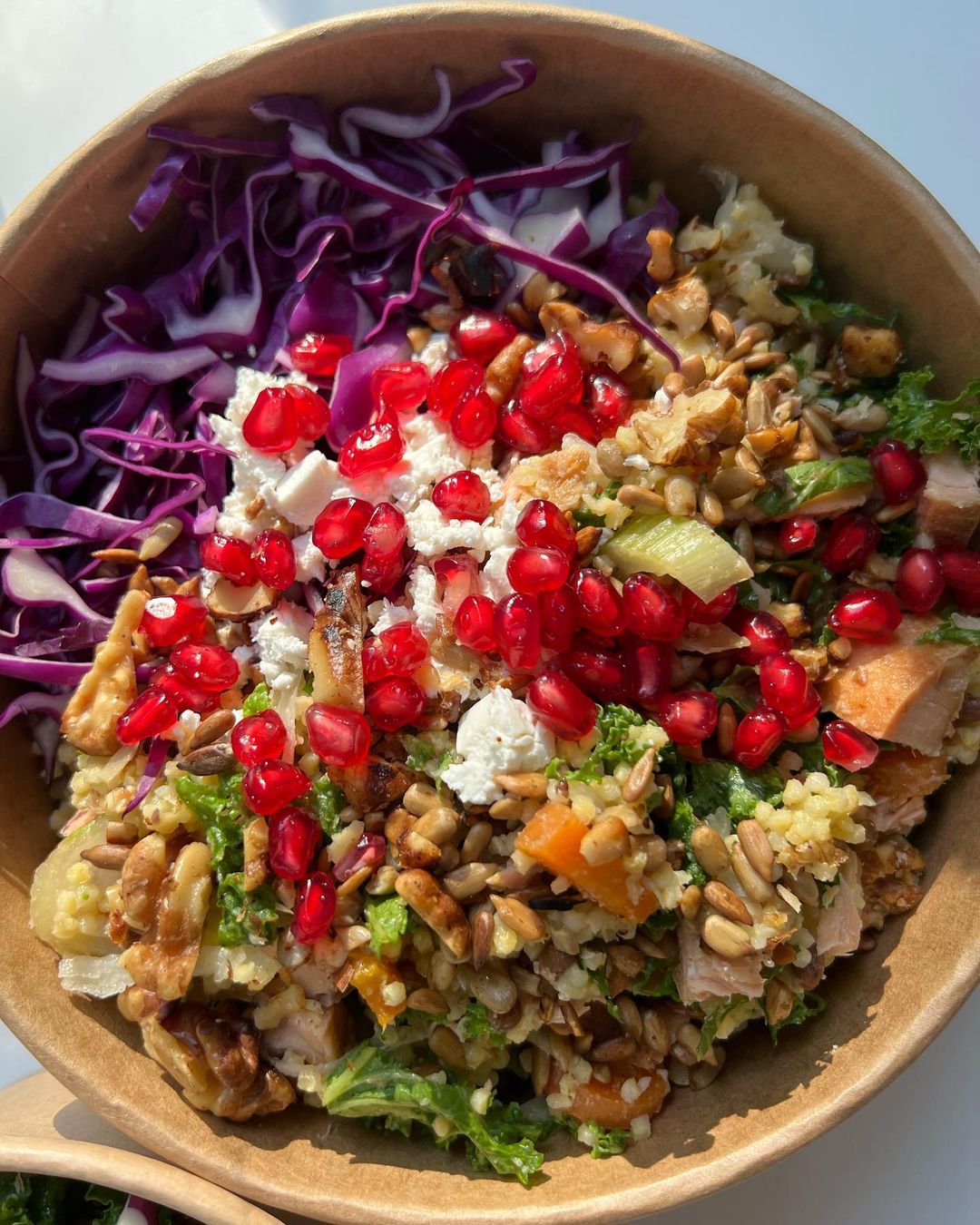 - Vse sestavine združite v skledo, dodajte suhe brusnice, feto sir v koščkih, granatno jabolko ter sončnična semena.