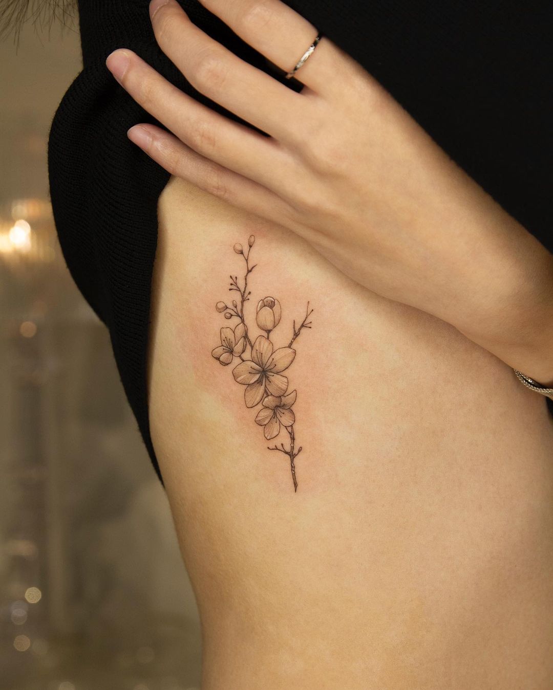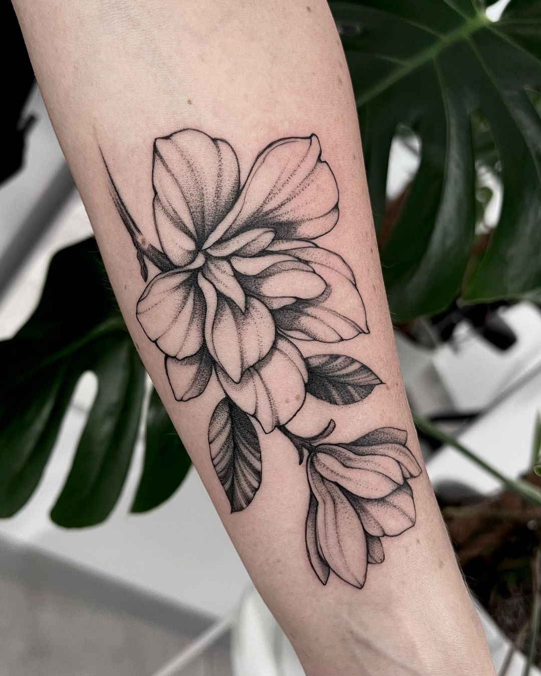 Te nežno spuščajoče se magnolije so čudovit primer večjih tetovaž, ki se še vedno zdijo minimalne. Minimalna tetovaža za največji učinek. Pomen: v zahodni kulturi sreča in stabilnost, v vzhodni kulturi plemenitost in čistost.