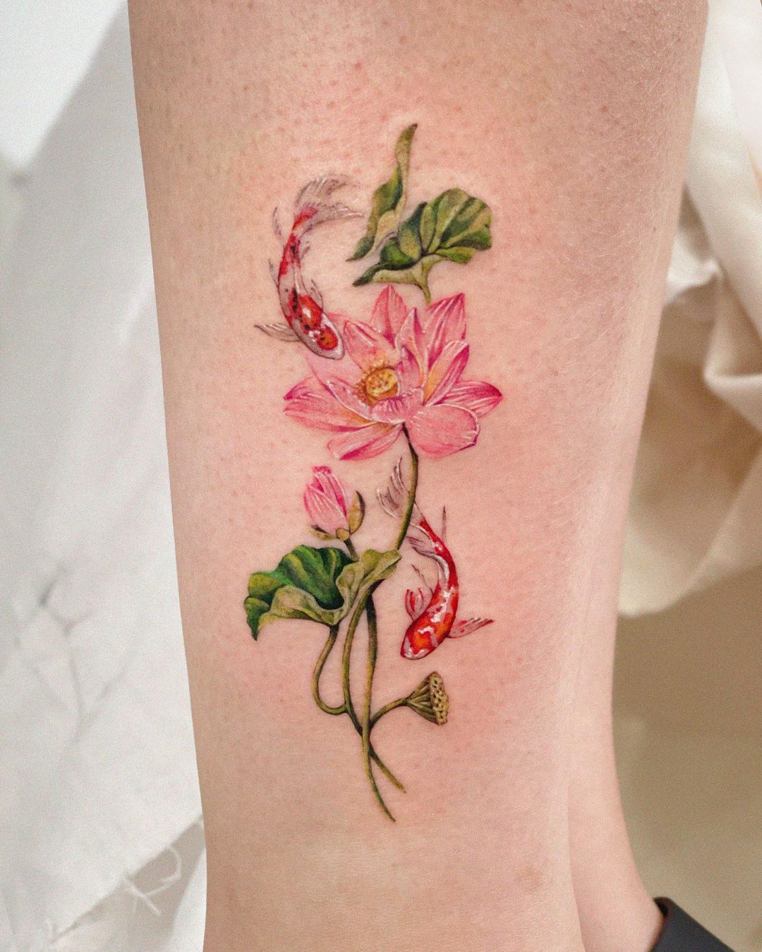 To je morda najboljša ilustracija lotosa, kar smo jih videli. Všeč nam je, kako ultra tanke črte naredijo cvetne liste skoraj prozorne. Kar zadeva simboliko za pogosto zahtevanim dizajnom, lotos pomeni odpornost in vztrajnost, saj je edinstvena roža, ki cveti v vodi in blatu.
