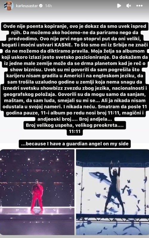V nadaljevanju je zapisala, da “to ni prvič, ampak stoprvič, da so pomembni in bogati za nami,” ter dodala: “Če smo iz Srbije, še ne pomeni, da ne moremo narekovati pravil in moja želja s prihajajočim albumom je globalna prepoznavnost. Da dokažem, da lahko kljub temu, da prihajam iz male države, zatresem tla, tako kot pravimo v šovbiznisu.”