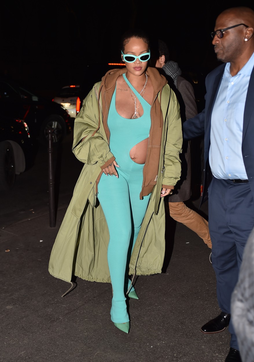 A ni edina, ki te dni dviguje prah s svojimi čudaškimi opravami. Naziv kraljice bizarnih outfitov še vedno pripada noseči Rihanni, ki kljub zimi in mrazu rada postavi na ogled svoj nosečniški trebuh. Tokrat je presenetila v oprijetem turkiznem pajacu, ki je razkazoval njen dekolte in trebuh.