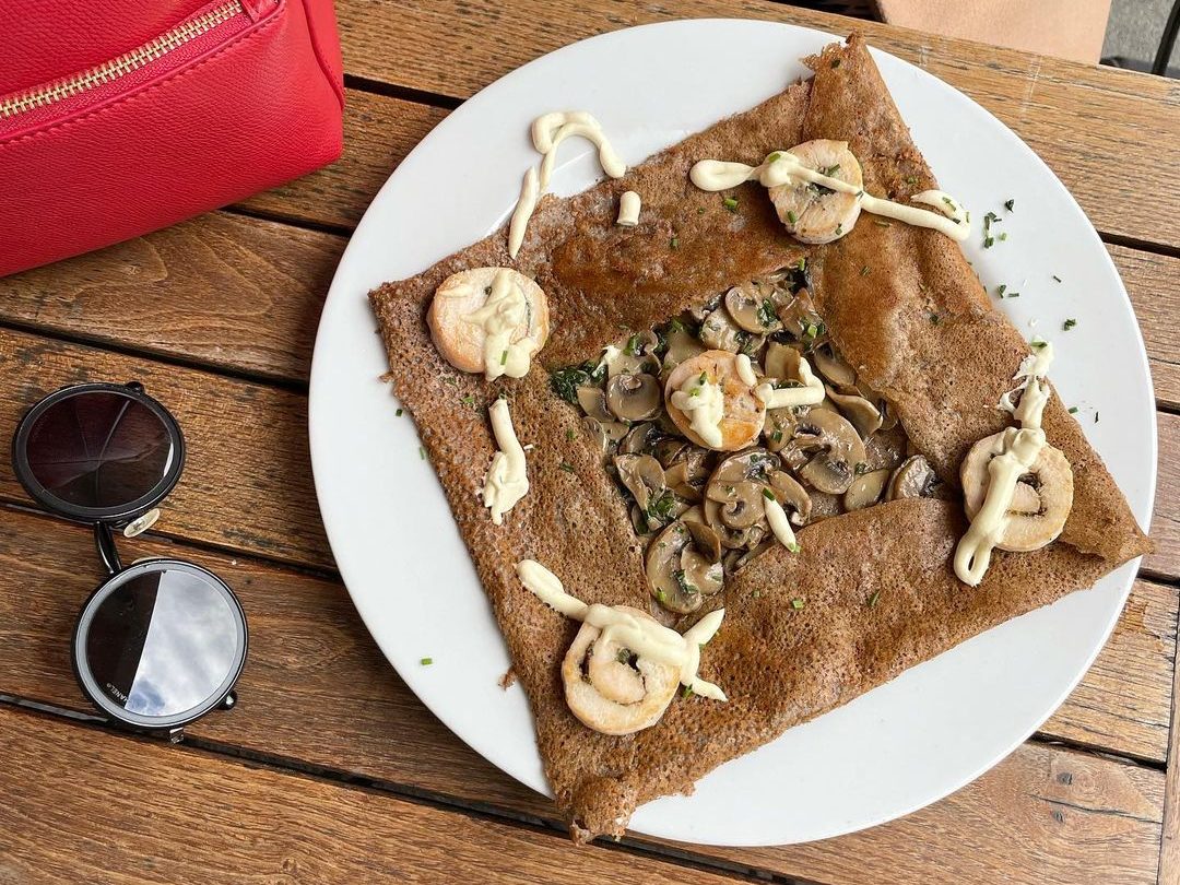 Galette so osrednja ponudba bistroja in na voljo v kar nekaj različicah. Sodelavka je izbrala ajdovo galetto La Dijonaisse z enako rulado v zeliščni skorjici kot je bila v solati, družbo pa so ji delali šampinjoni z zeliščnim maslom in hišni Dijon gorčični preliv. Palačinka je bila tako rahla, da se je kar stopila v ustih, medtem ko so bili šampinjoni ravno prav sotirani, da niso bili preveč razkuhani inn so ob ugrizu še rahlo zahrustali. Omaka je odlično povezala celotno jed, še enkrat pa je bila jed količinsko povsem zadostna.