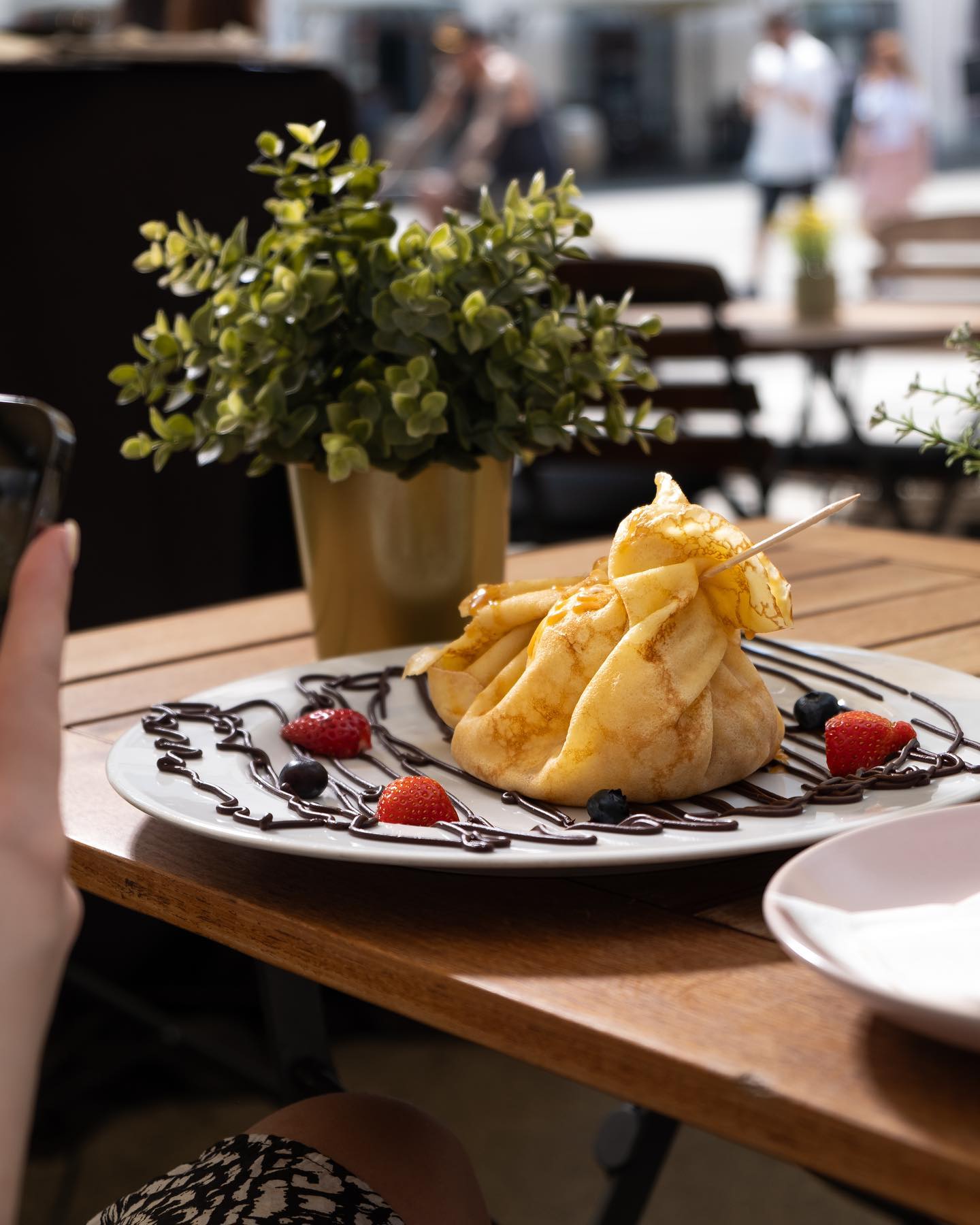 Pogačarjev trg je ena bolj slikovitih in kulinarično bogatih lokacij v Ljubljani. Pod slovitimi oboki v neposredni bližini, ki so dovršeno Plečnikovo delo, se nahaja bistro Norma 23. Tam boste na račun prišli vsi ljubitelji francoske kulinarike, ki obožujete predvsem njihove slovite palačinke. Eno priljubljenih slanih različic sva preizkusili s sodelavko, poleg tega pa odkrivali še okuse razkošne solate s piščancem, seveda pa nisva mogli izpustiti palačink v sladki različici.