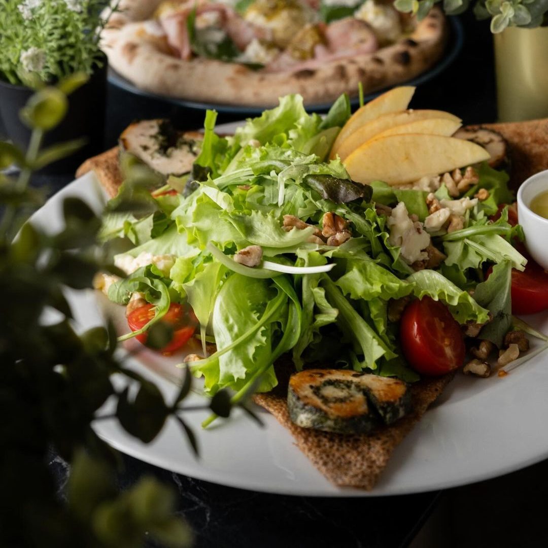 In še kako prav je imela. Norma 23 je razkošna solata na ajdovi galetti (slani palačinki), ki jo sestavljajo sezonska solata, Brie sir, jabolka, orehi, češnjevi paradižniki, hišni gorčični preliv in rulada piščančjih prsi v zeliščni skorjici. Rulada je bila okusna, ravno prav slana in začinjena, orehi in Brie sir pa odlična kombinacija in dopolnitev. Ne bi imela nič proti, če bi bilo v solati malce več jabolka, sicer pa je bila solata odlična, okusi uravnoteženi in ravno dovolj preliva za količino solate. Sem se najedla? Pošteno!