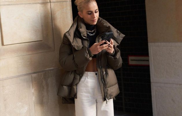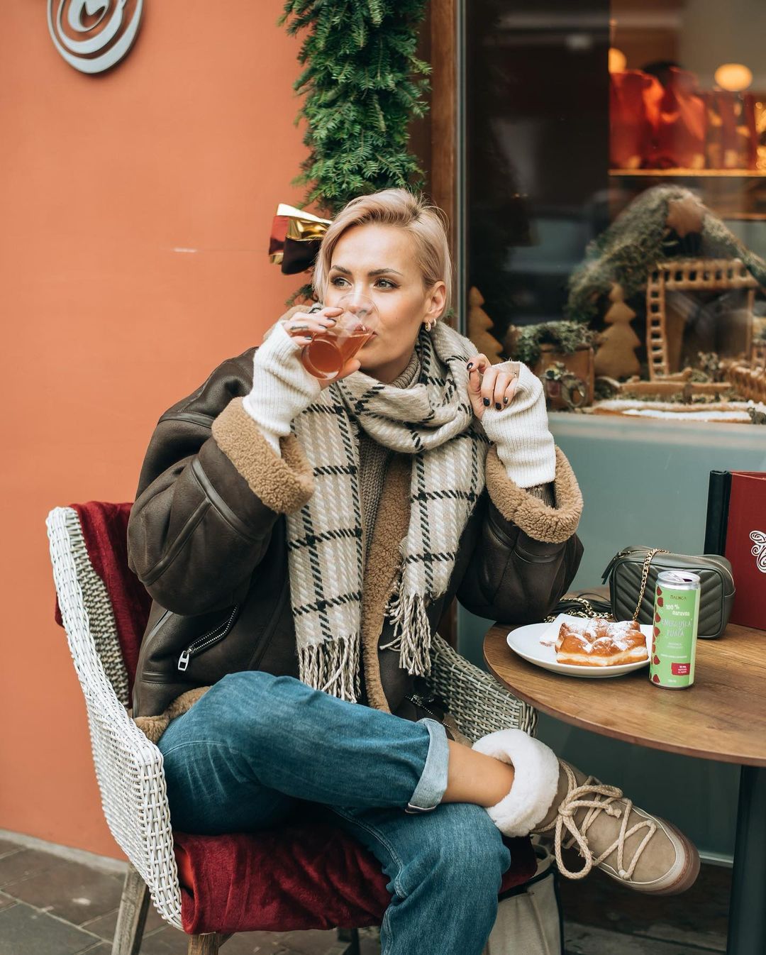 Enostavno ni oblačila ali obutve, ki ne bi pristajala h kavbojkam. Tjaša je k njim oblekla bež pulover in ga kombinirala s trendi aviatorsko jakno. Kavbojke je zavihala in tako dala na ogled svoje svetlo bež skibucke. Njihova bela obroba se odlično ujema z rokavicami brez prstov in šalom, ki skupaj ustvarijo harmoničen videz.