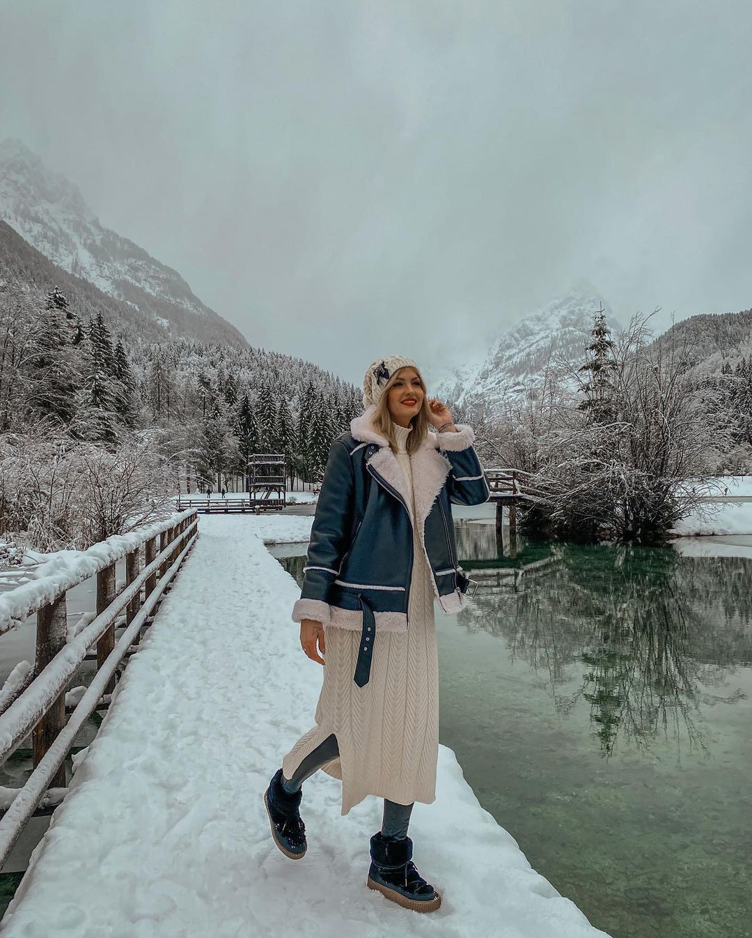 Če ste mislile, da lahko skibucke nosite samo k hlačam, ste se krepko zmotile! Tjaša dokazuje, da so odlično videti tudi z obleko. Poskrbite samo, da si pod njo oblečete dovolj debele najlonke. Tjaša se je odločila kar za črne pajkice, ter k dolgi, pleteni beli obleki oblekla še daljšo usnjeno jakno in videz dopolnila z ljubko belo kapo. Zelo prikupno in popolno za nepozabna doživetja na snegu!