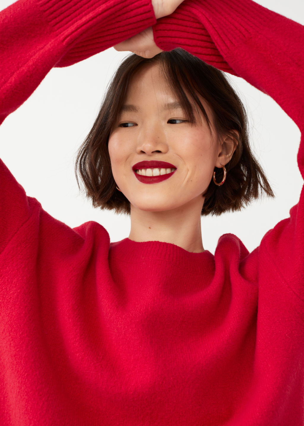 Če boste novo leto preživeli doma, ob slastni večerji, prijetni glasbi in družinskih članih, izbreite udobje. A pozor, to ne pomeni trenirke! Oblecite eleganten rdeč pulover, ki bo z zlatim nakitom in rdečimi ustnicami izpadel zelo elegantno.