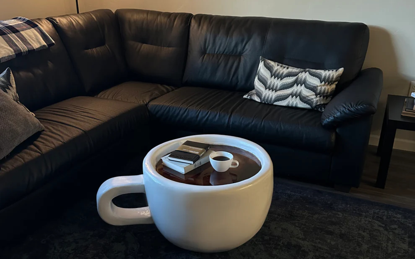 Miza v obliki klasične bele keramične skodelice za kavo z ročajem je v celoti ročno izdelana. Lahko se jo postavi v poslovne prostore in kavarne, primerna pa je tudi za vse velike ljubitelje kave in posebnih dizajnerskih kosov pohištva.