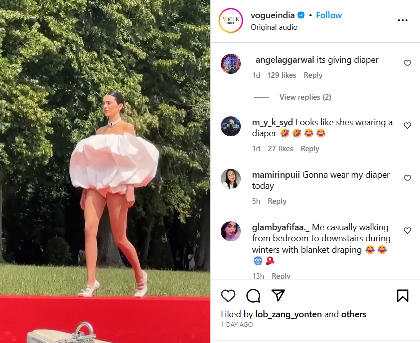 “Videti je kot plenica,” so se razgovorili sledilci na Instagram profilu Vogue India, nekateri pa so tudi opazili, da se Kendall pri nošenju kreacije nenavadno mršči. “Zakaj je videti, kot da je zavohala nekaj slabega,” se je vprašal eden od sledilcev in dodal: “Morda zato, ker nosi velikansko plenico?”