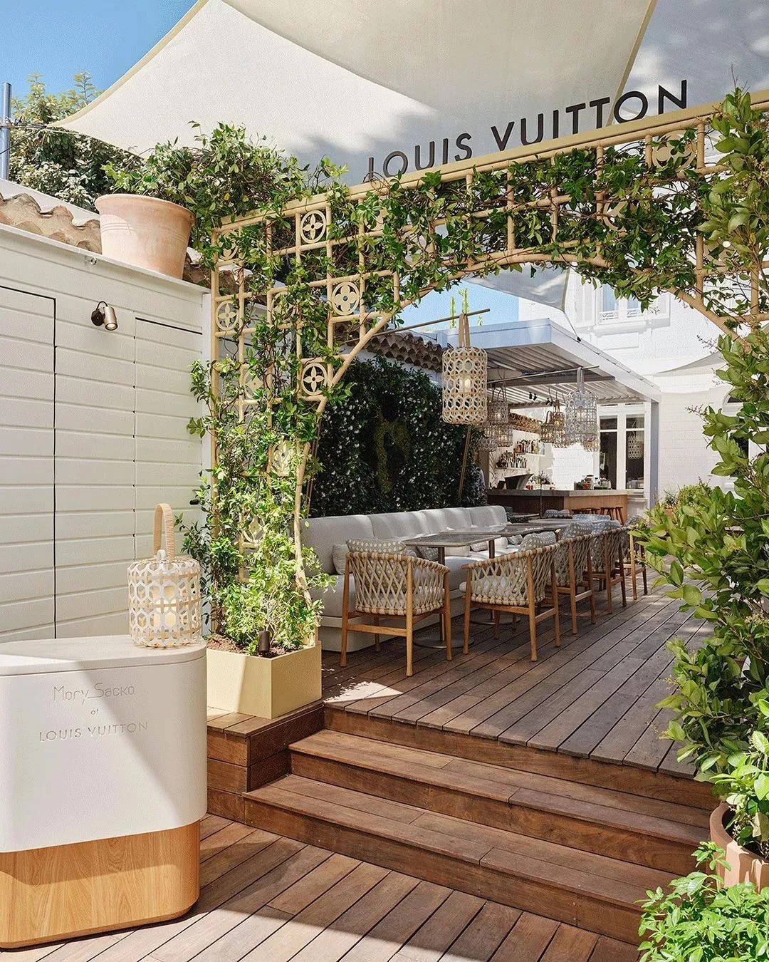 Restavracija je urejena v sredozemskem slogu, s svetlo paleto barv in naravnimi materiali, povsod pa so detajli Louis Vuittona, kot je njihova značilna roža – v tej obliki je urejeno celo grmovje!
